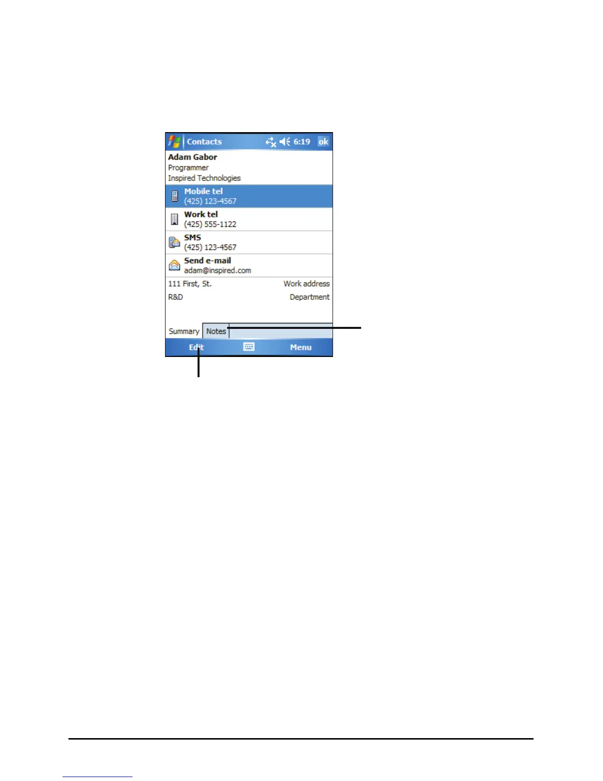 When you tap a contact in the contact list, a summary screen is displayed. To