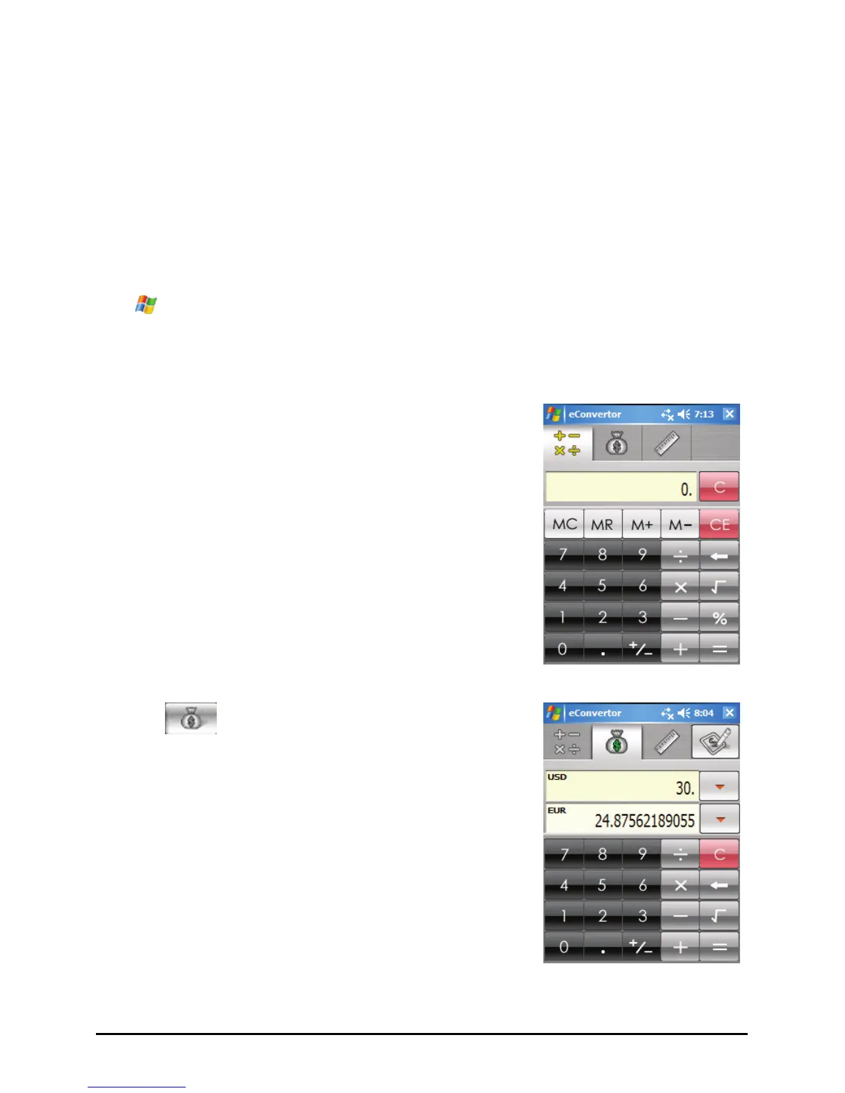 eConverter provides three modes: Calculator, Currency, and Metrology. You