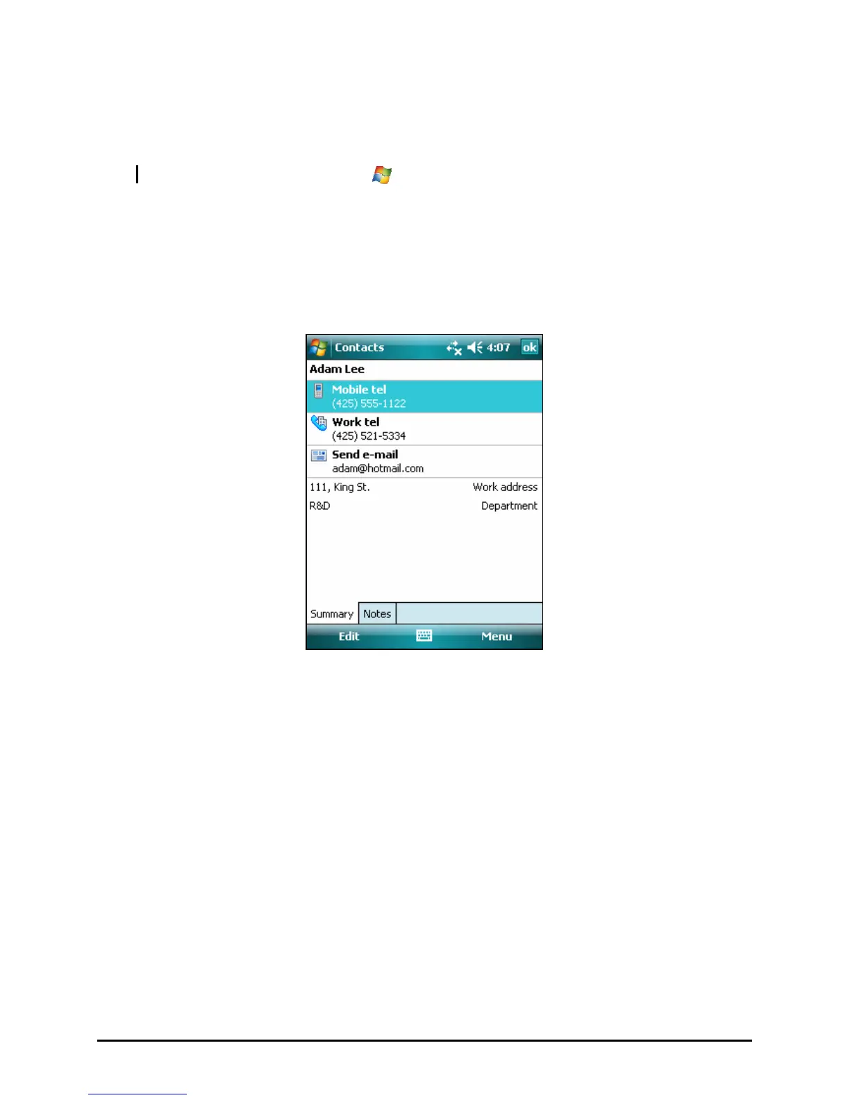 When you tap a contact in the contact list, a summary screen is displayed. To
