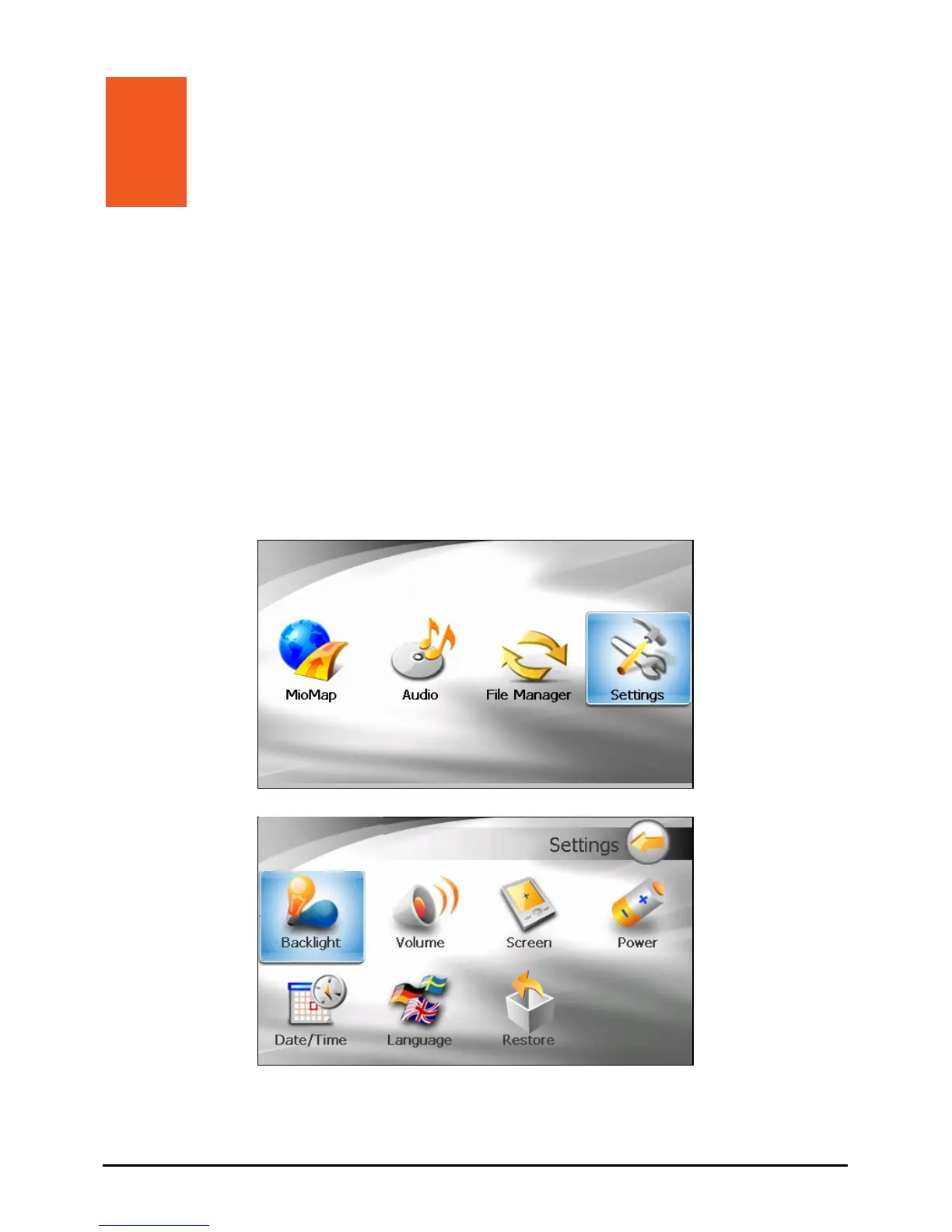 Mio DigiWalker C320 - Settings; Starting and Exiting Settings