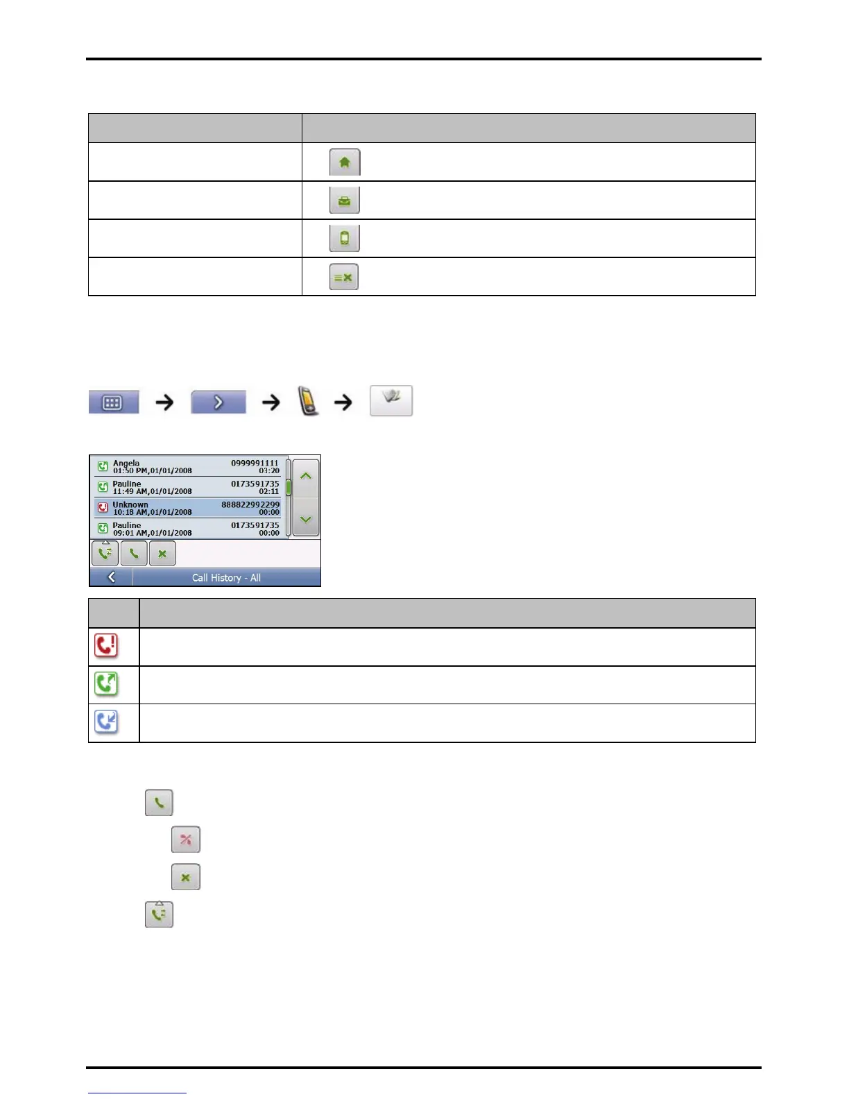 Note: The call history lists the calls made during the time your Mio is connected to a mobile phone.
