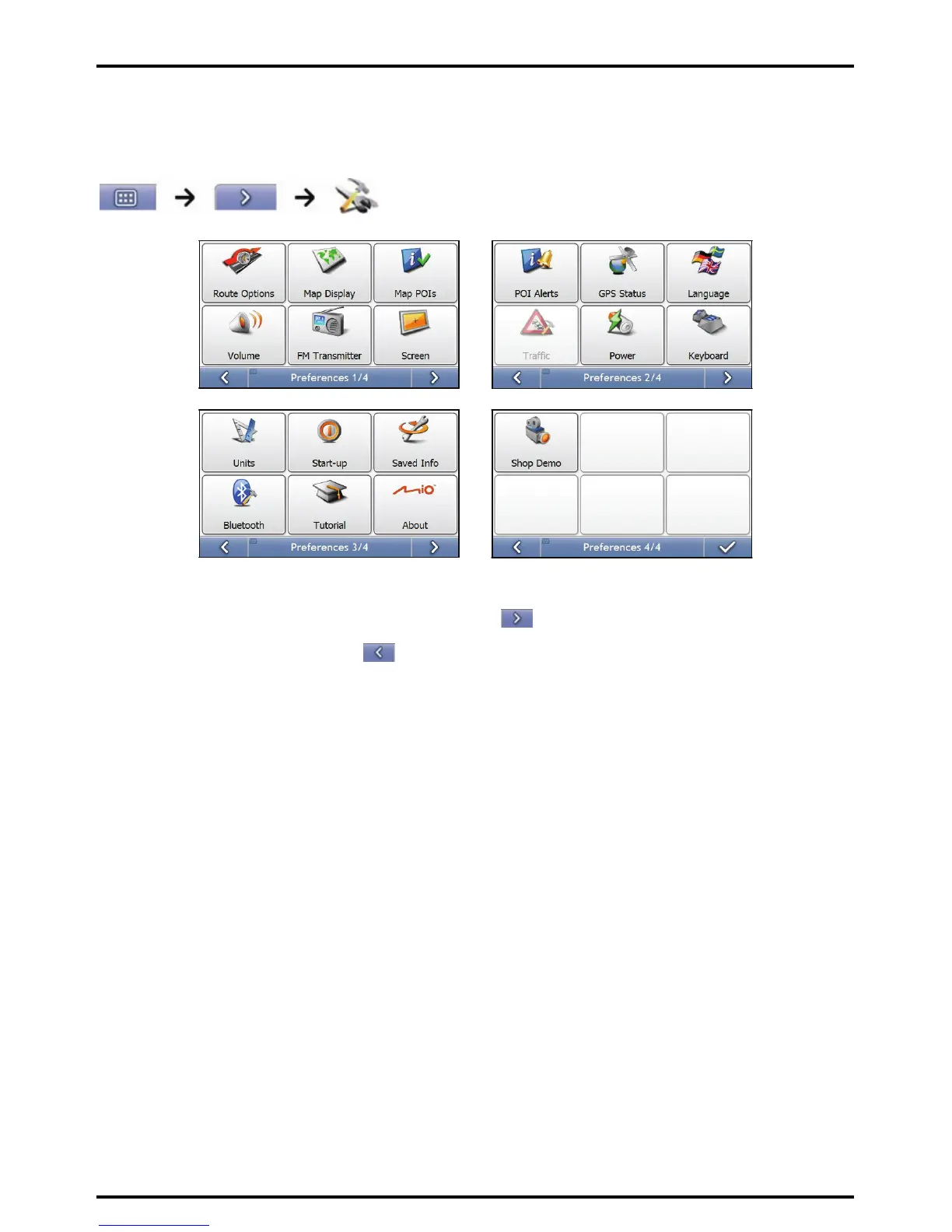 Note: The Preferences screens may differ from those displayed above, depending on your Mio model.