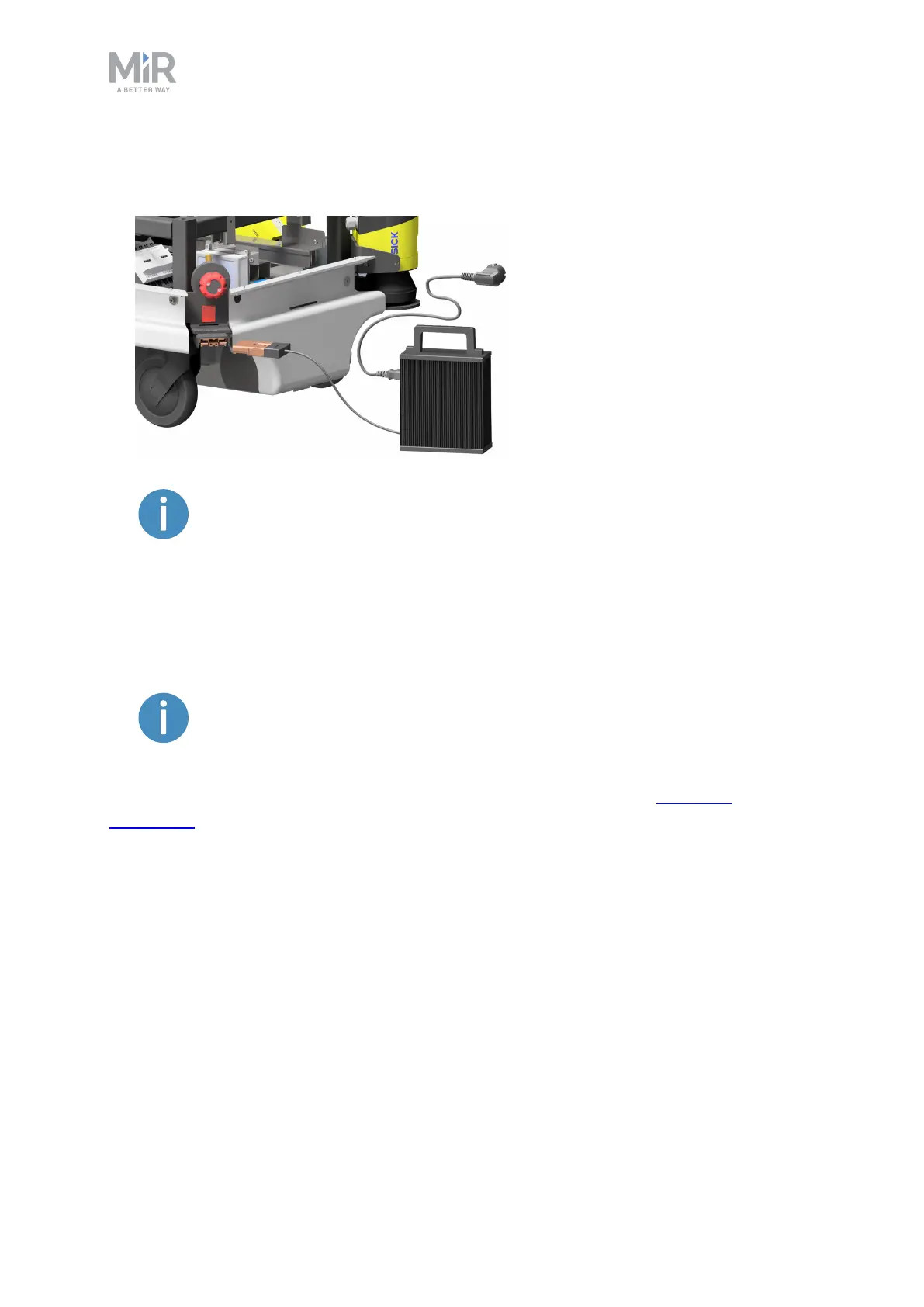 For information about the charging time, see the robot specifications at www.mir-