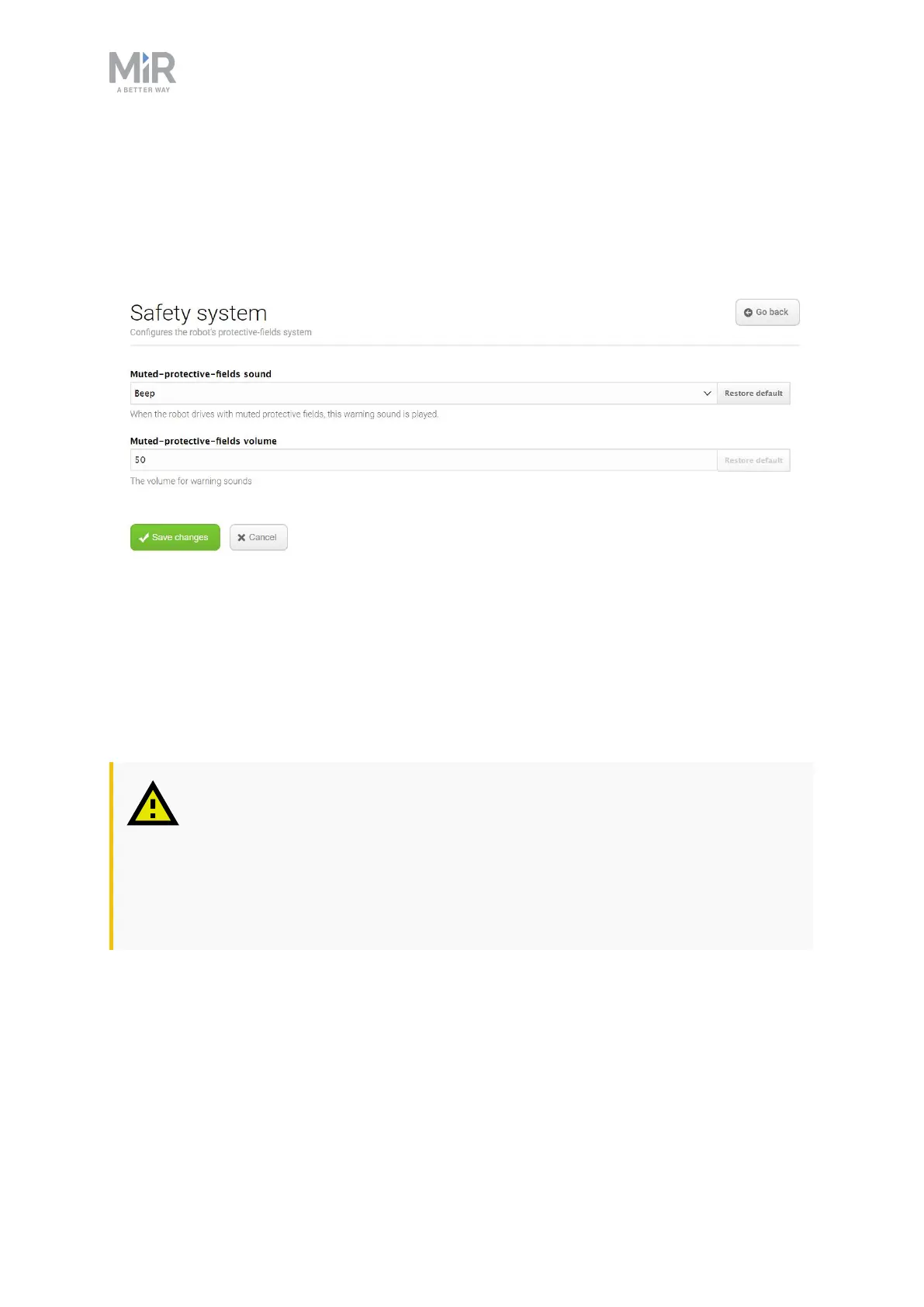 Figure 11.26. In the Safety system section, you can change the robot's warning sound.