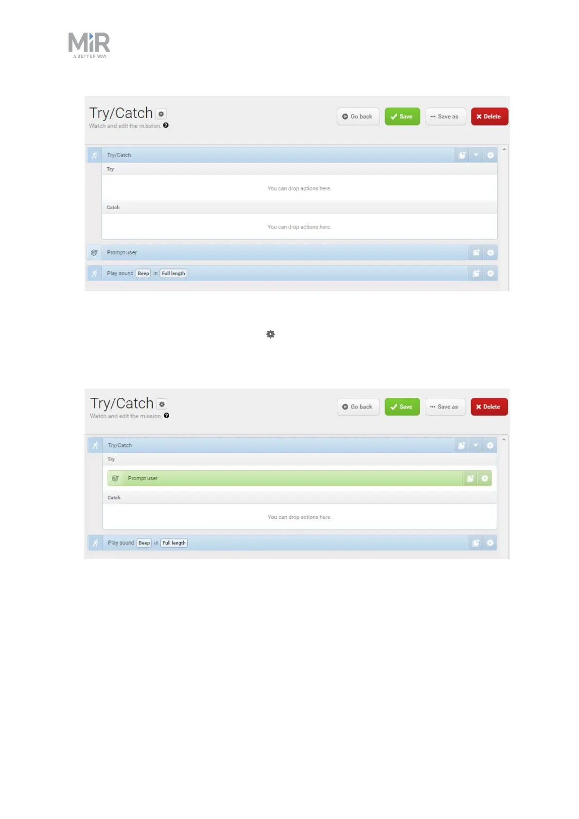 4. Drag the Prompt user mission into the Try box under Try/Catch.