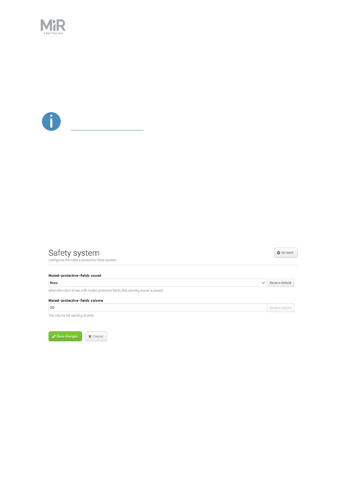 Figure 11.28. In the Safety system section, you can change the robot's warning sound.