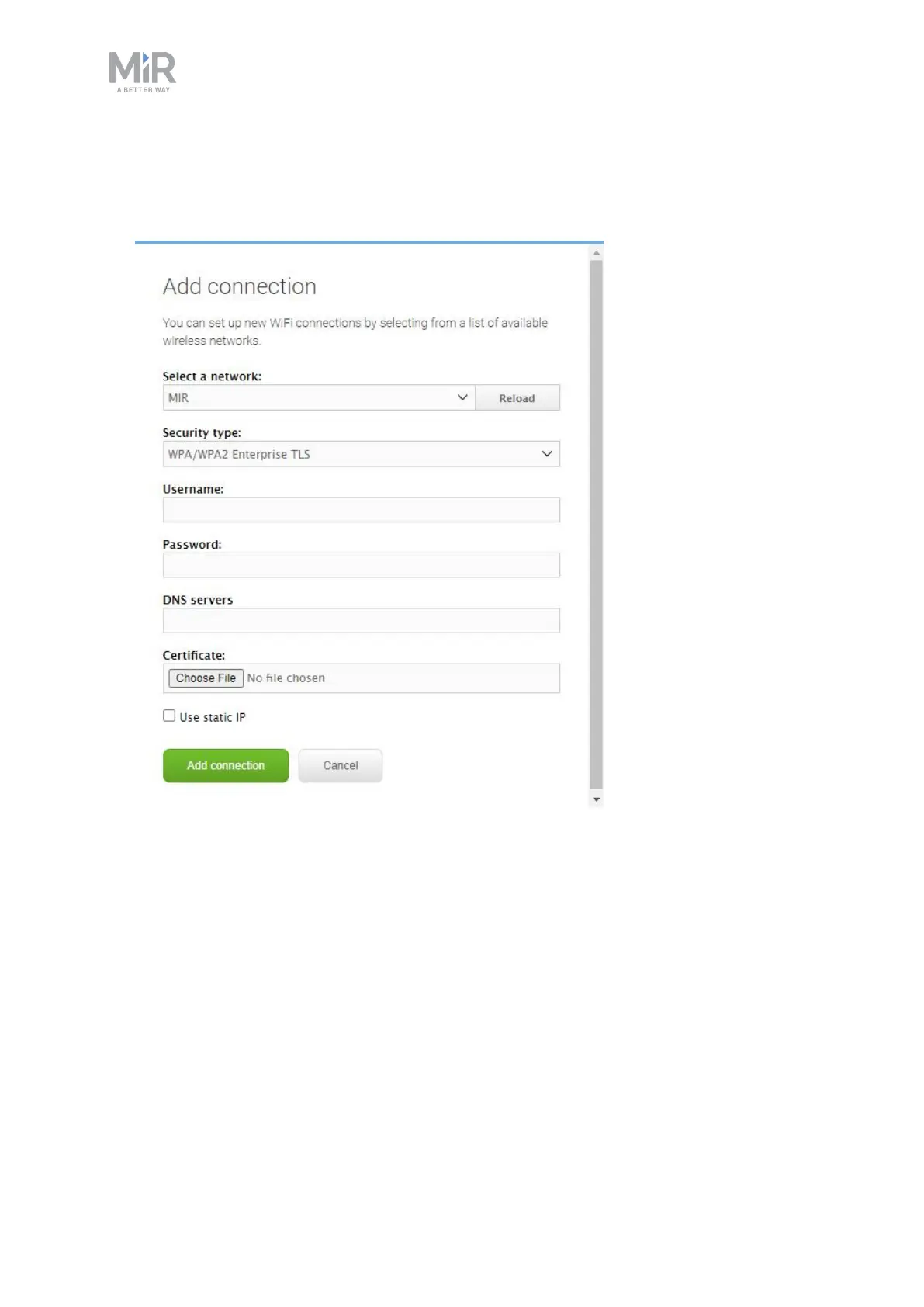 displayed fields—see the guide How to connect a MiR robot to a WiFi network for