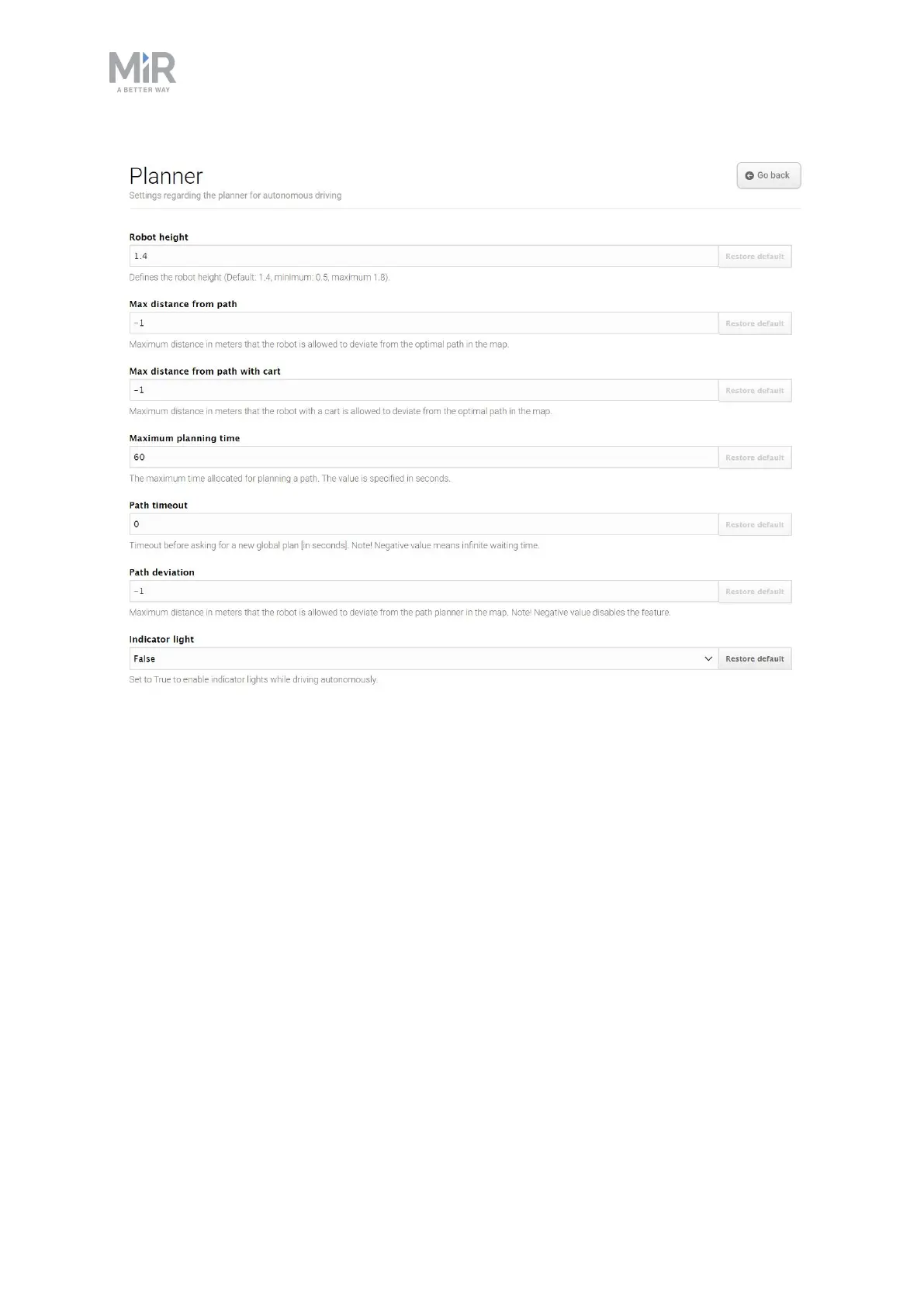 Figure 9.22. You set basic parameters for driving the robot in the Planner section.