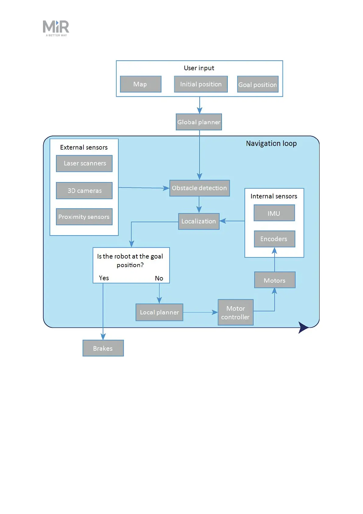to generate a path to the goal position. The robot executes the steps in the navigation loop until it reaches the