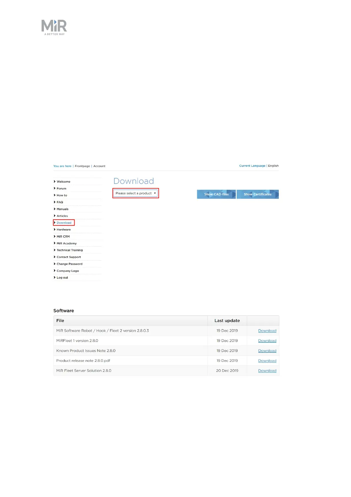 2. Select Download and select MiR500 in the product drop down menu.