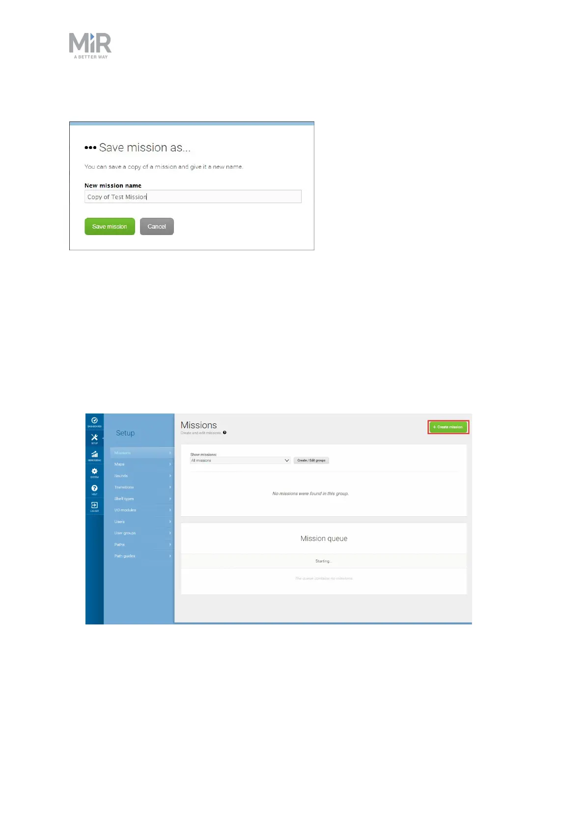 1. Go to Setup > Missions. Select Create mission.