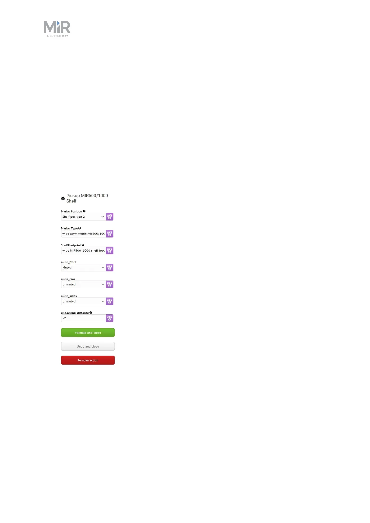 6. Under Pick up MiR500/1000 Shelf, set the Marker position to the position you want to
