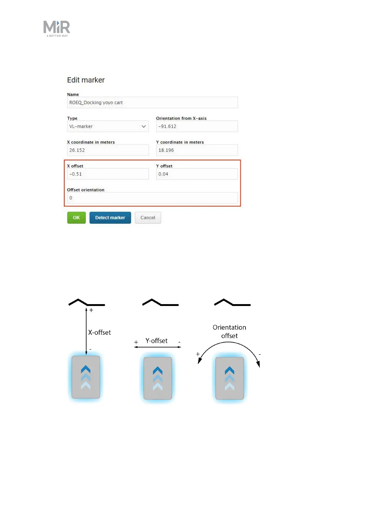 • The X-offset moves the robot closer to or further from the marker in meters.