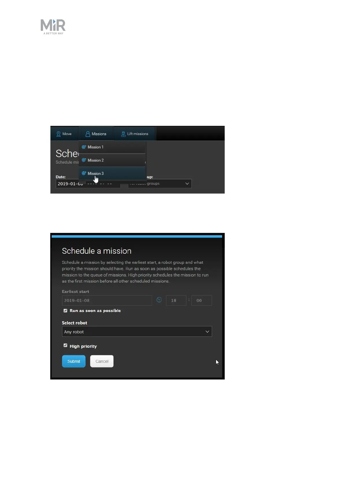 Missions are set up and monitored from the Scheduler menu. To schedule a mission, follow