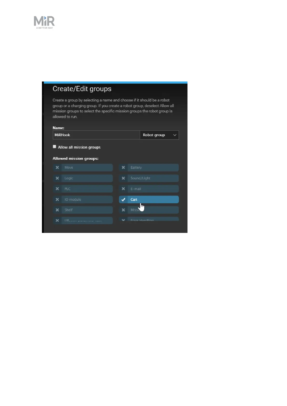 3. Select the Mission group you want to add to the Robot group. When you create a Robot