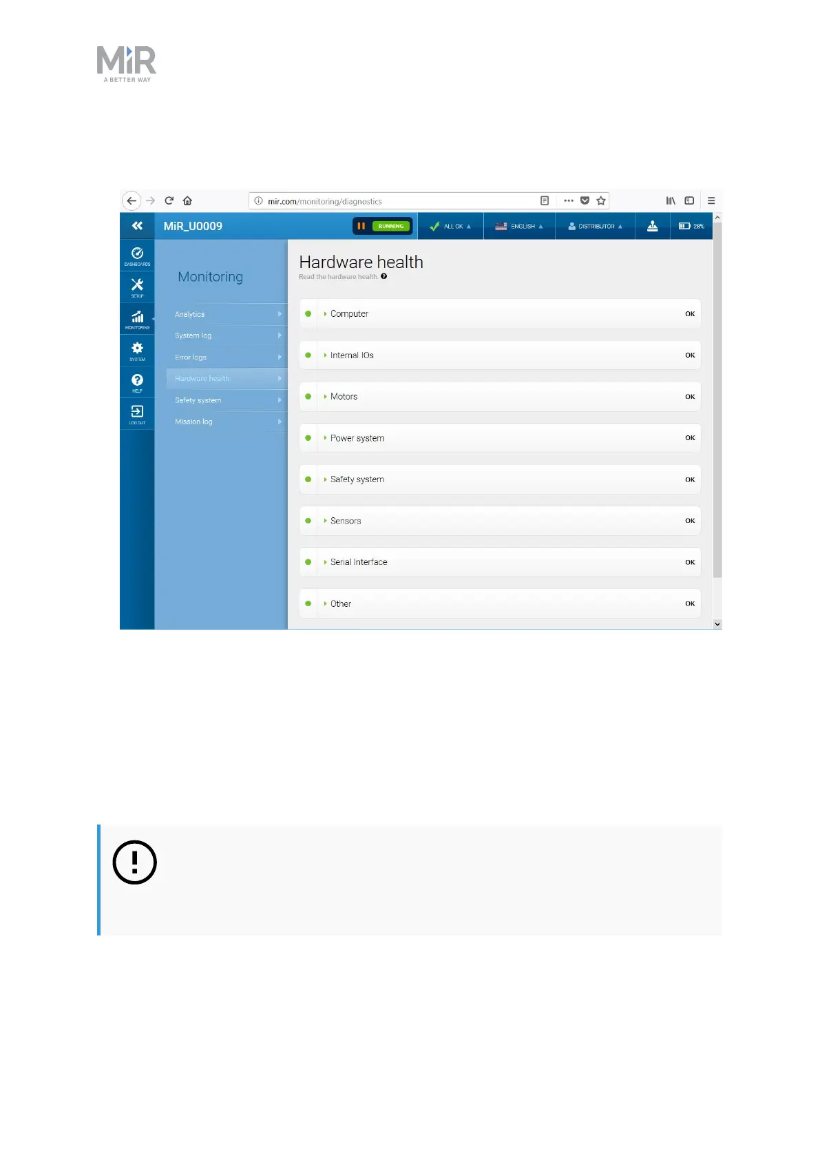 For more information, see Hardware health in MiR Robot Reference Guide on the MiR