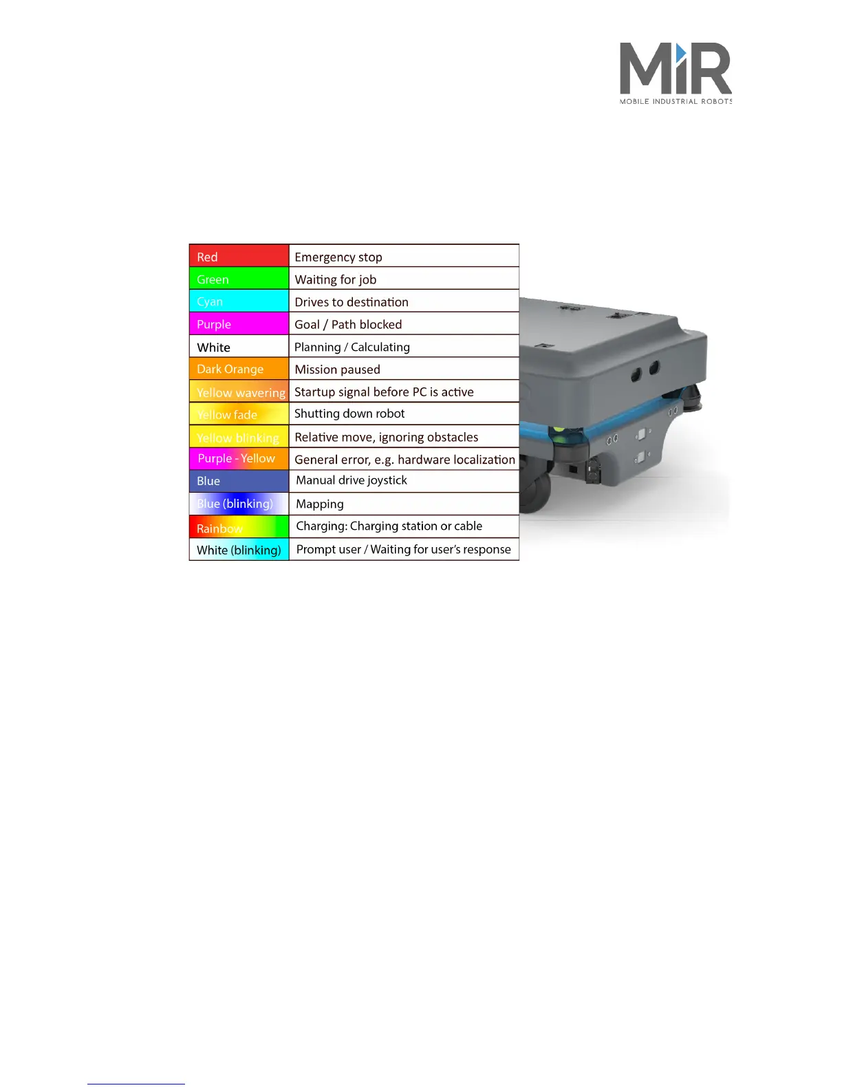 The light indicators on the MiR200™ indicate current operational state. Colors may be adapted to