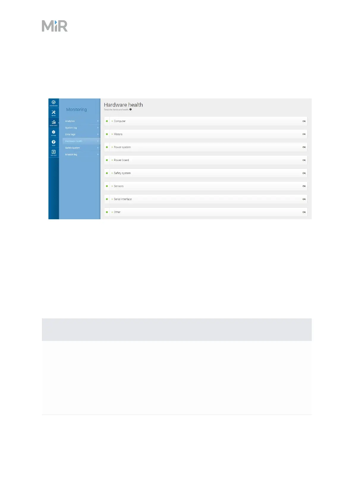 Sign in to the robot interface and go to Monitoring >Hardware health. The interface displays
