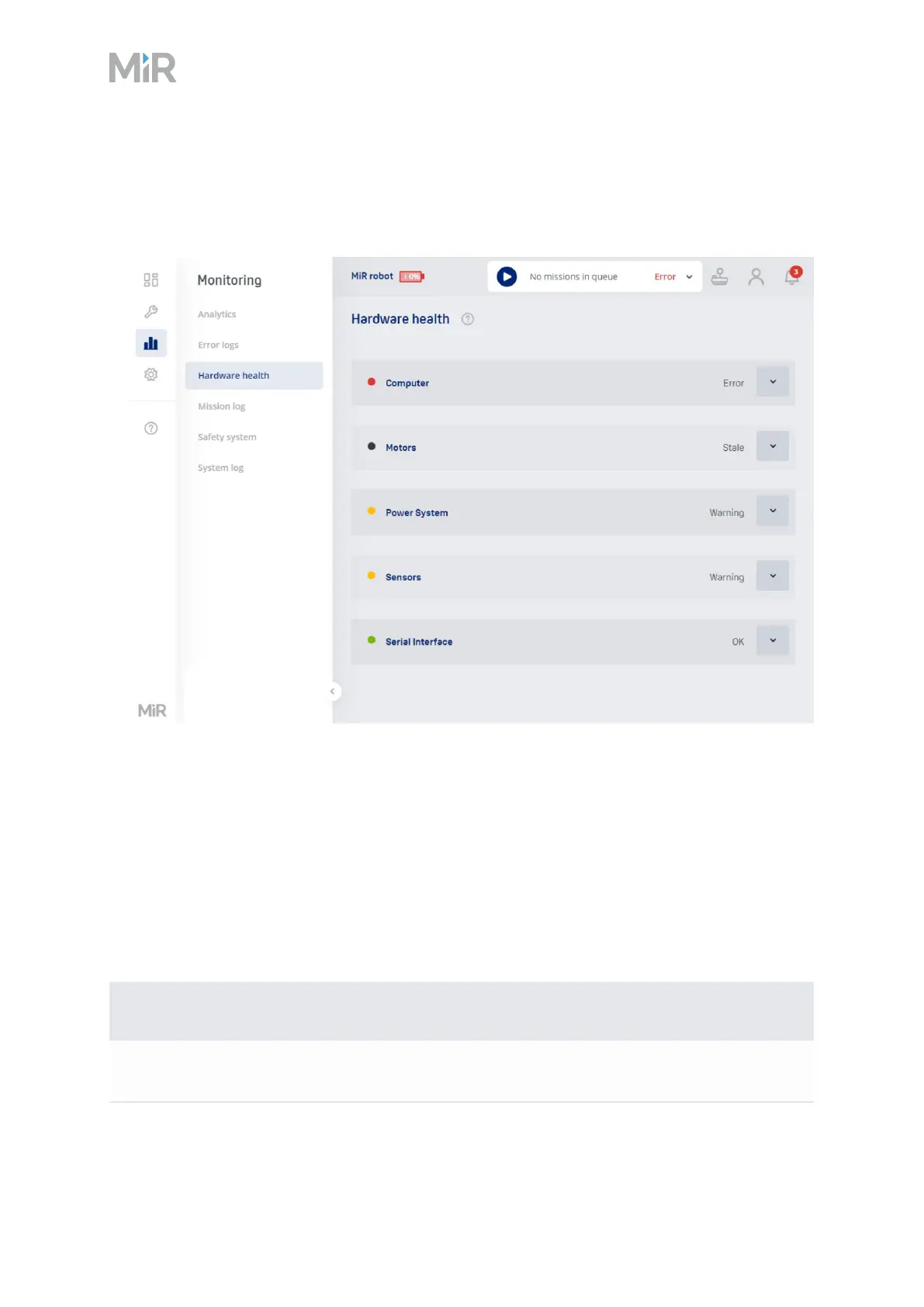 Sign in to the robot interface and go to Monitoring >Hardware health. The interface displays