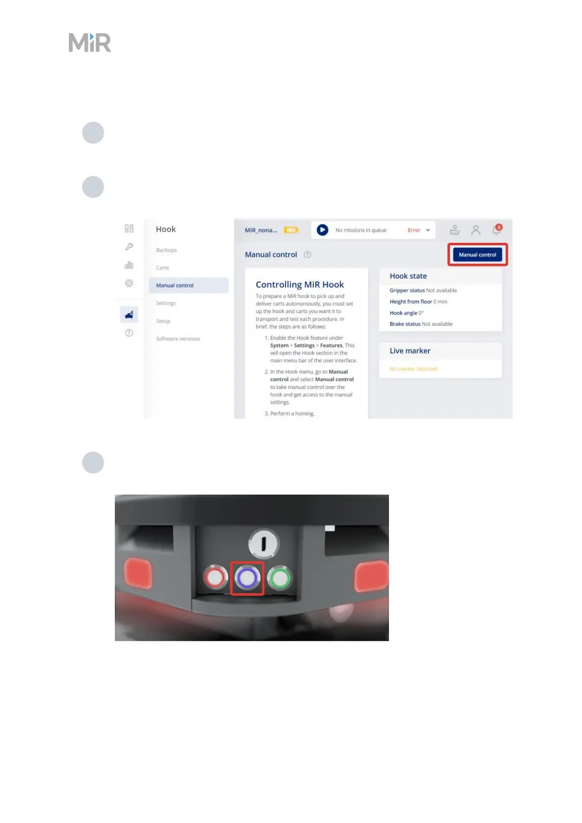 2 In the robot interface, go to Hook > Manual control and select Manual control. The