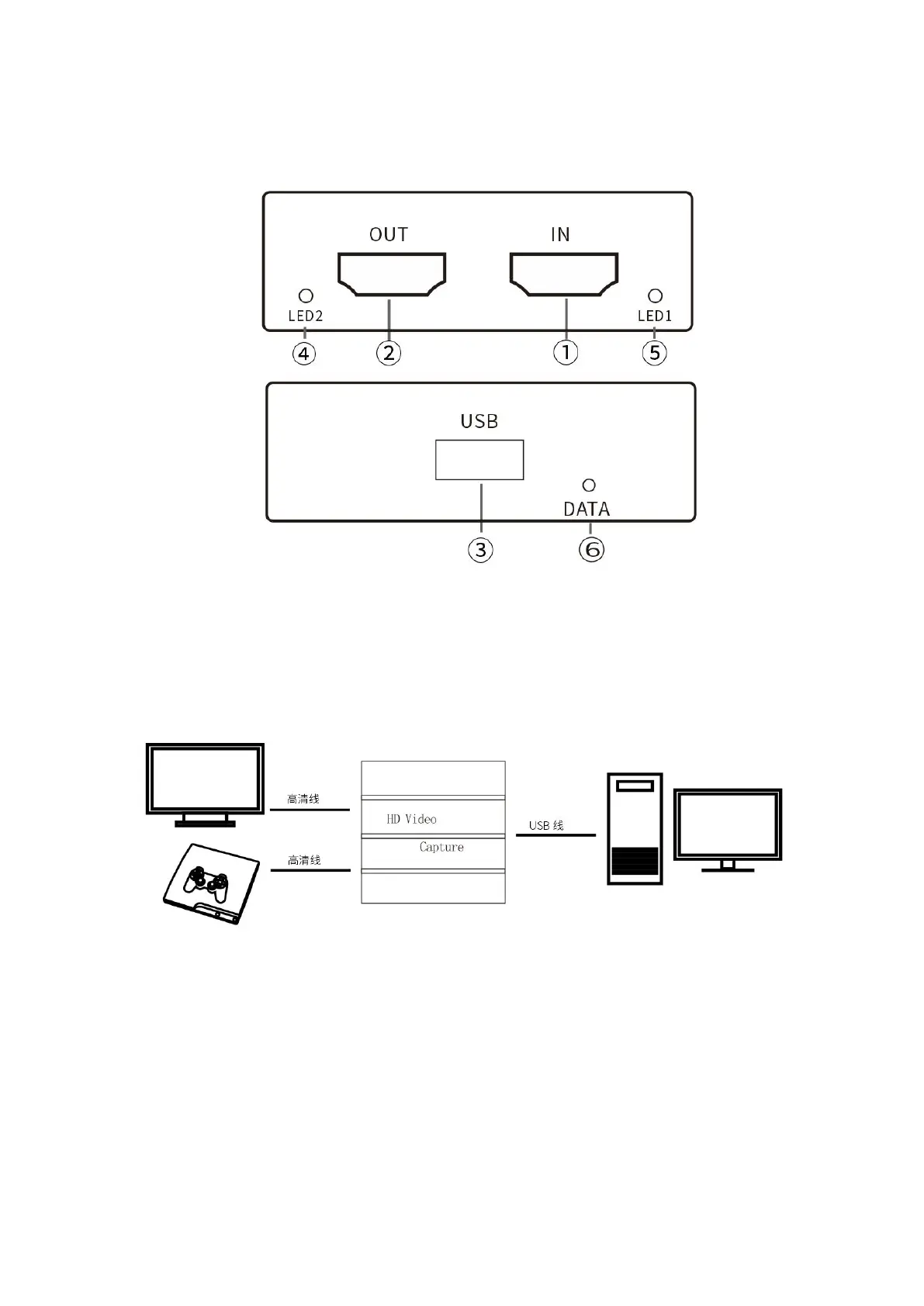 3. 接上需要采集的设备,USB 如有需要将显示器或电视机可以接上高清视频环出接口