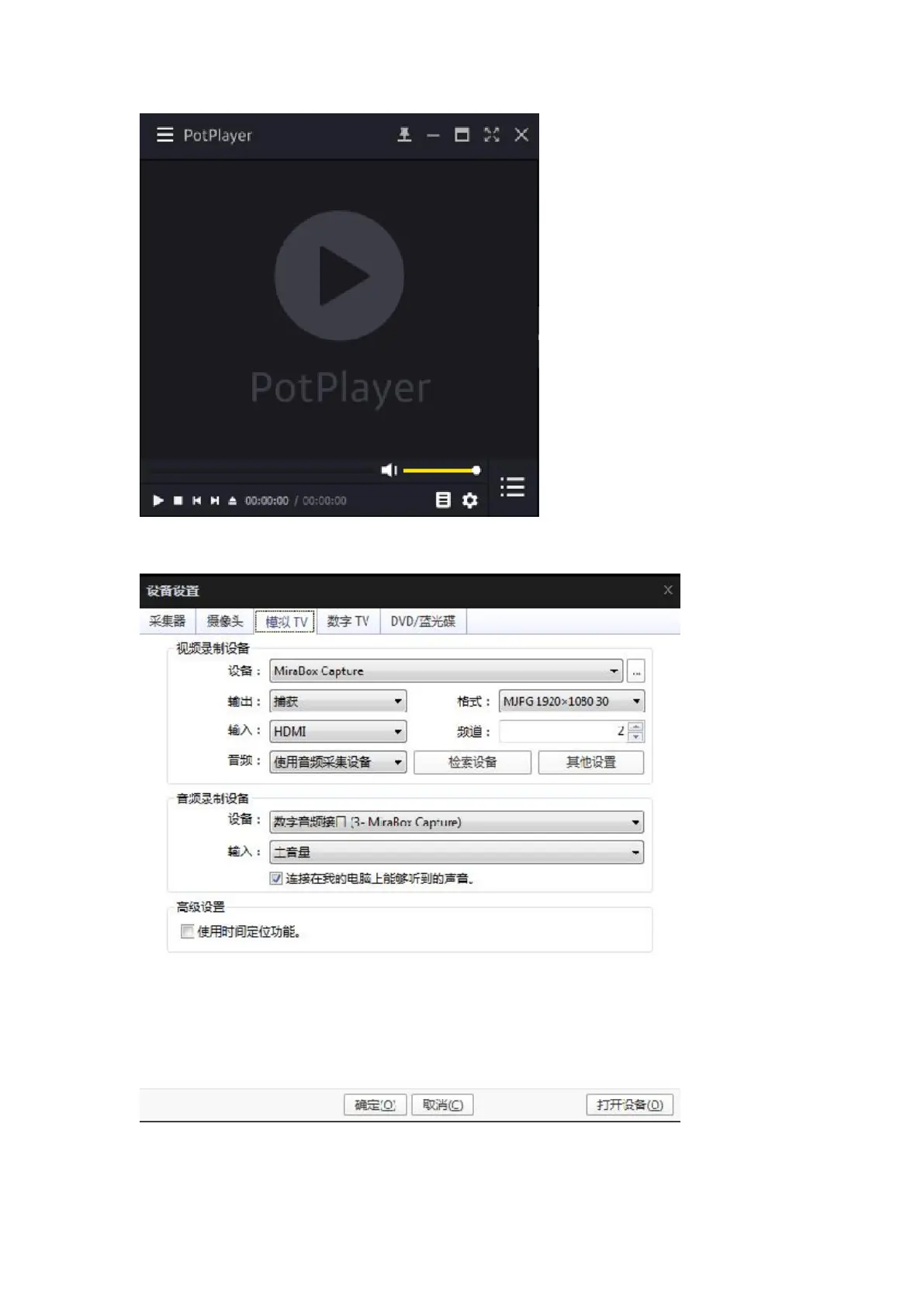 5. 点击 PotPlayer 菜单栏,点击打开,打开设备设置如 2 所示