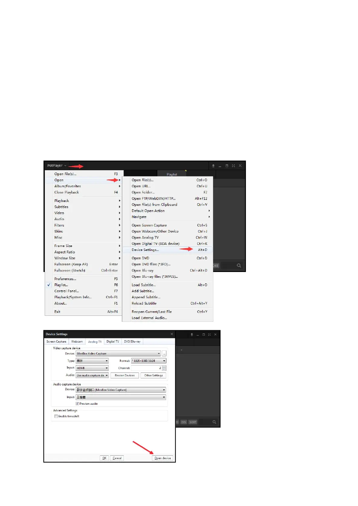 3. Clickupper left corner "PotPlayer” --- “Open” --- “Device setting” --- ”
