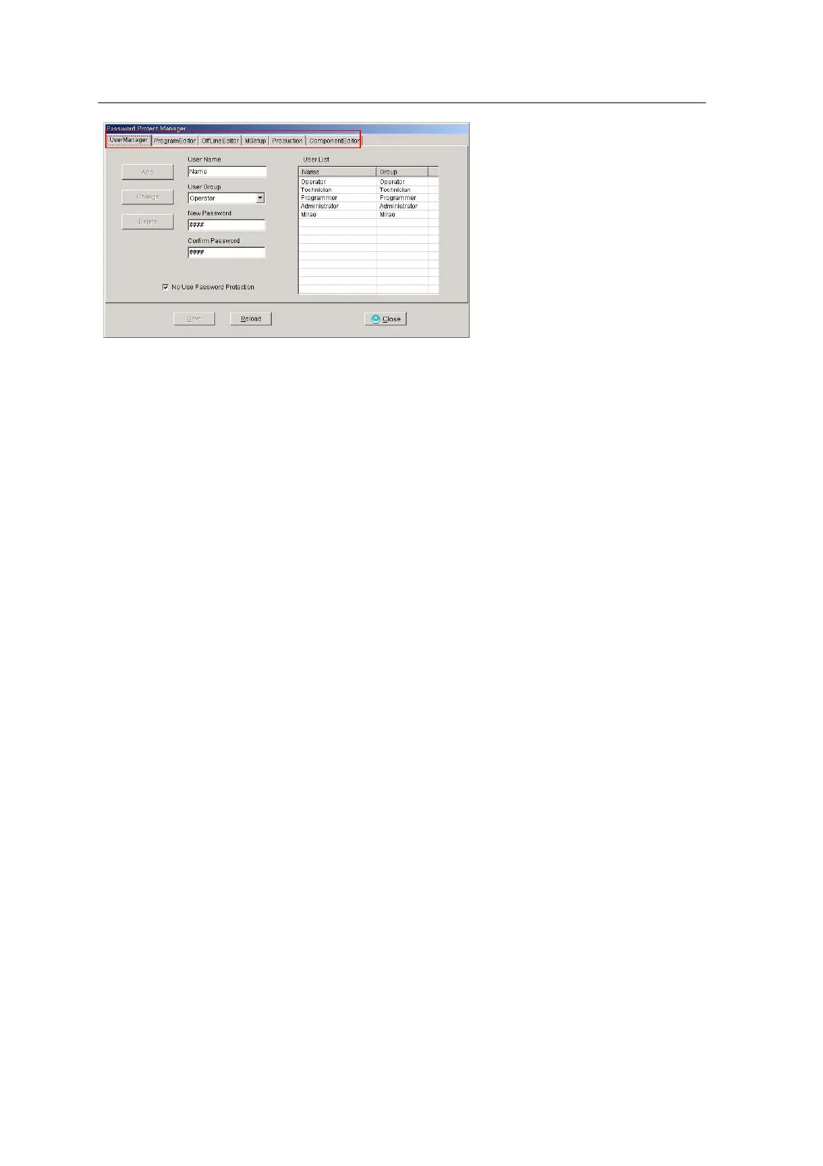 ProgramEditor, OfflineEditor, Msetup, Production and ComponentEditor tabs are used to permit