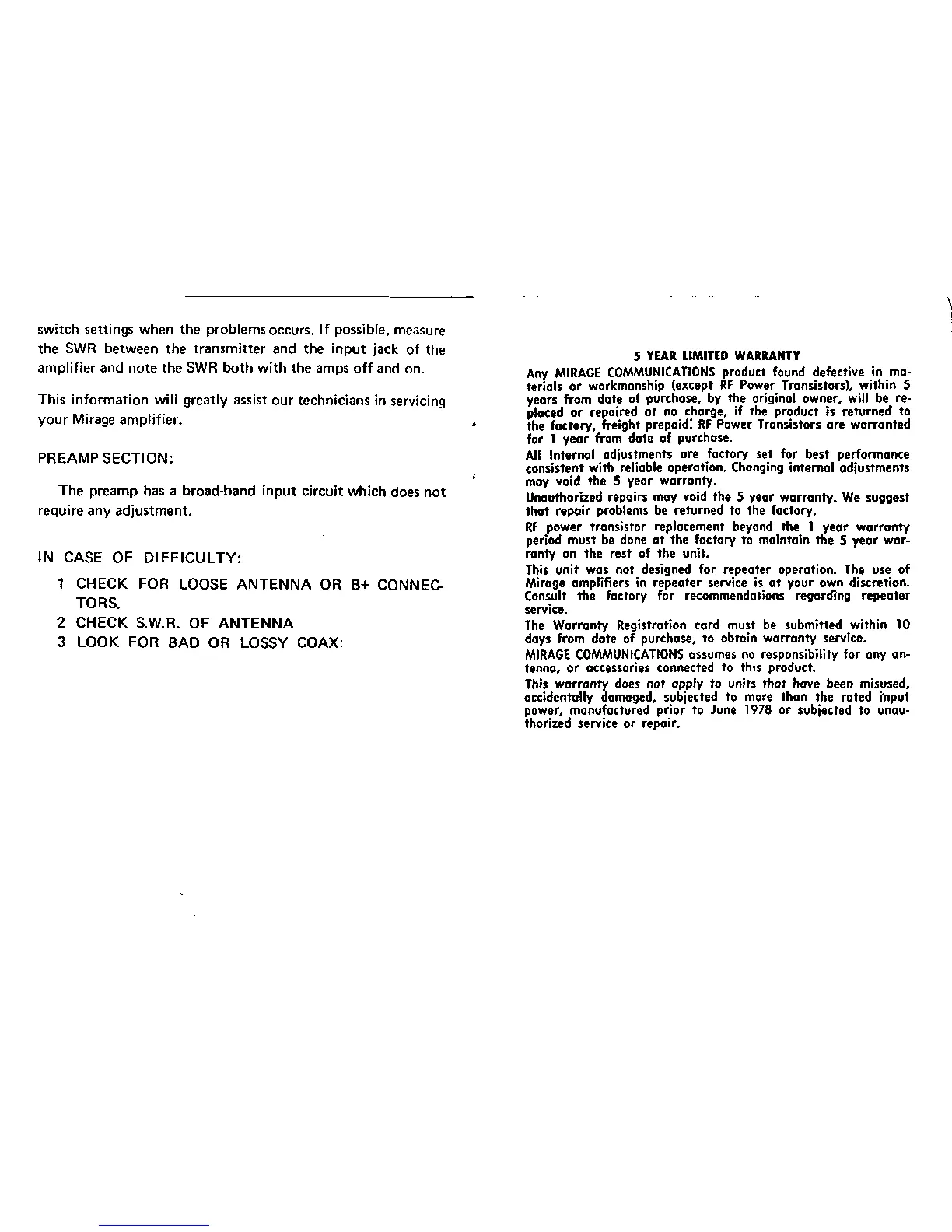 Mirage A1015 - Preamp Section; In Case of Difficulty; 5 Year Limited Warranty