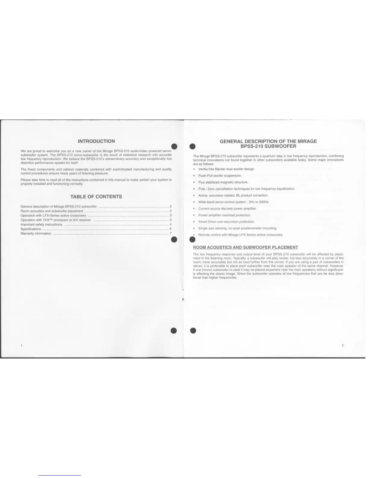 Mirage BPS210 - Introduction to Mirage BPSS-210; General Description of Mirage BPSS-210 Subwoofer; Room Acoustics and Subwoofer Placement