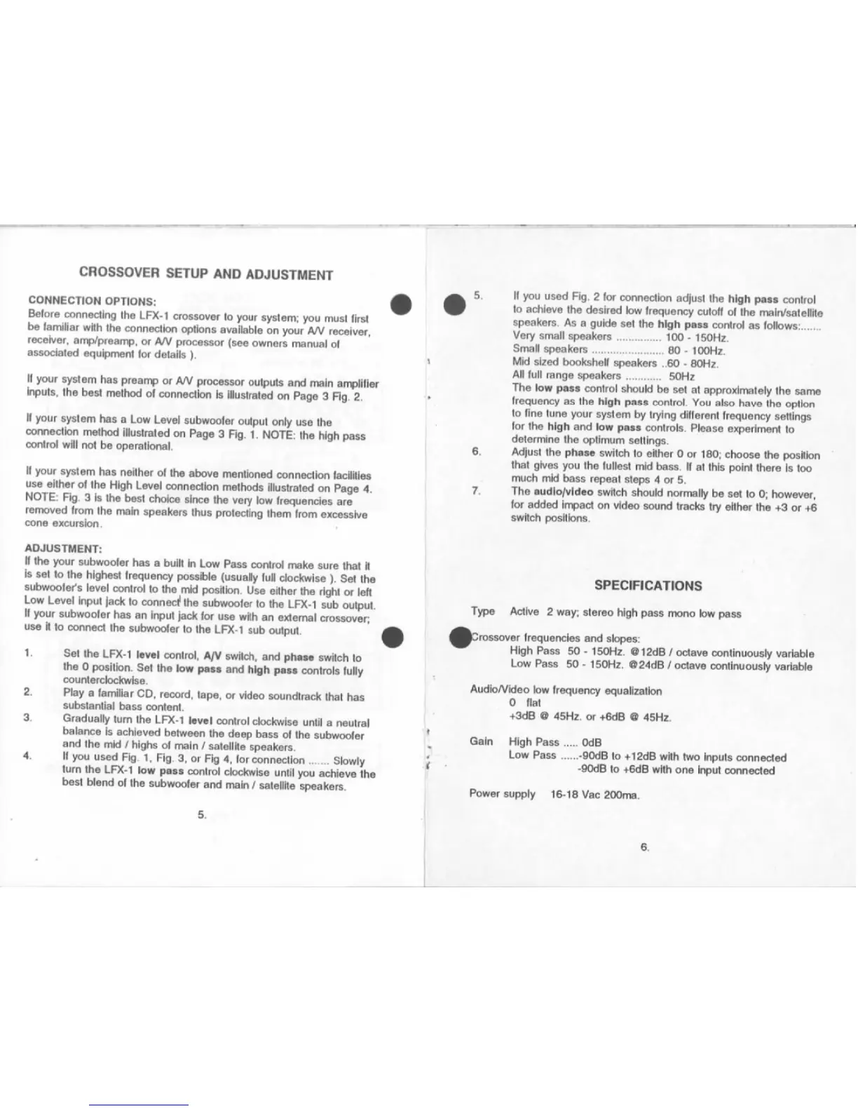 Mirage LFX-1 - Crossover Setup and Adjustment; Connection Options; Adjustment Procedures; Specifications