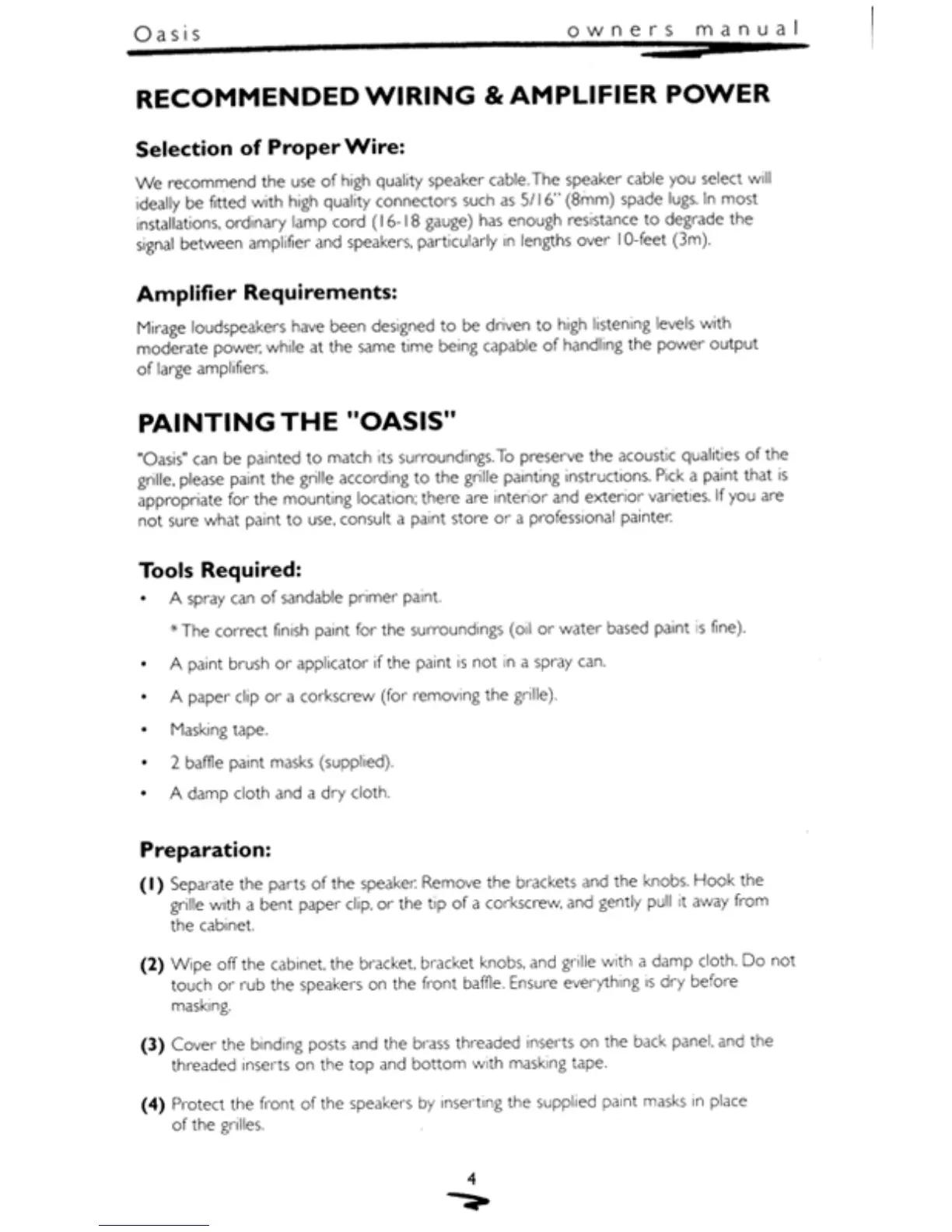 Mirage OASIS - Recommended Wiring & Amplifier Power; Selection of Proper Wire; Amplifier Requirements