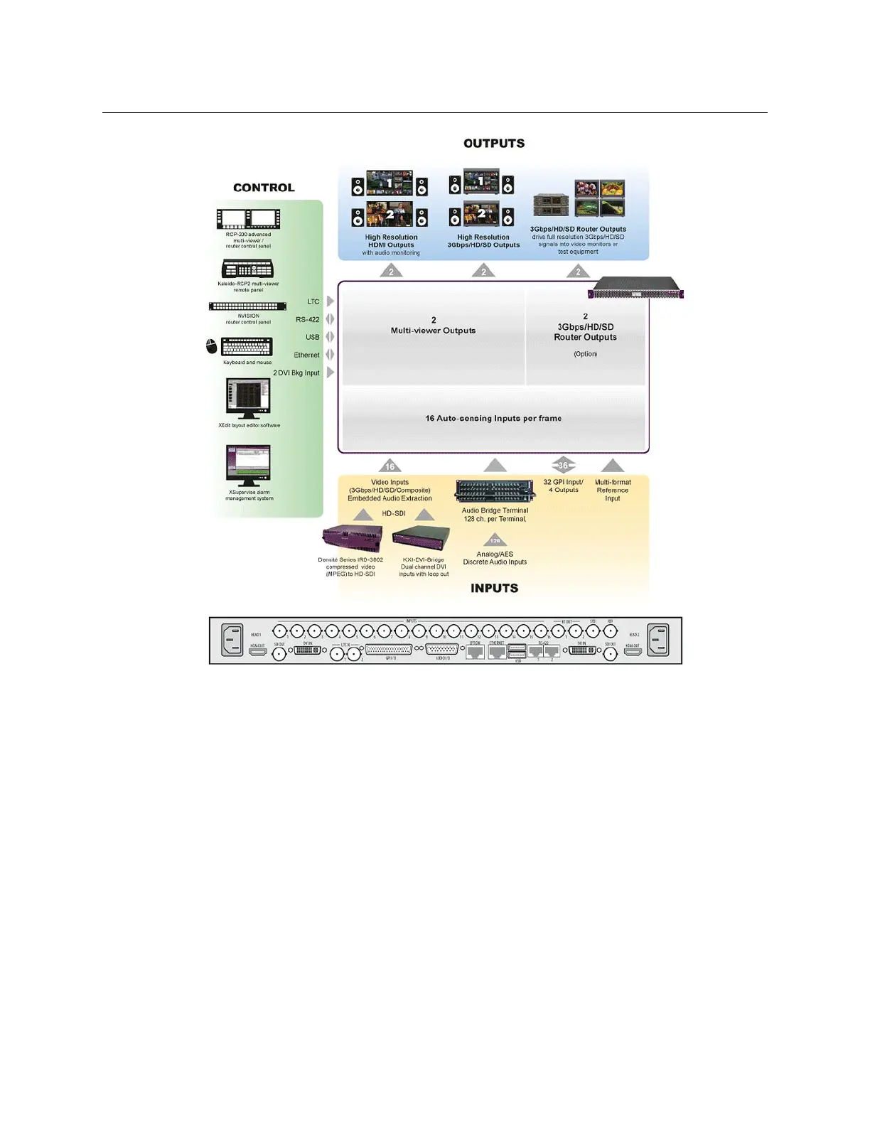 • 16 auto-sensing 3Gbps/HD/SD/Analog video inputs, one or two independent HDMI
