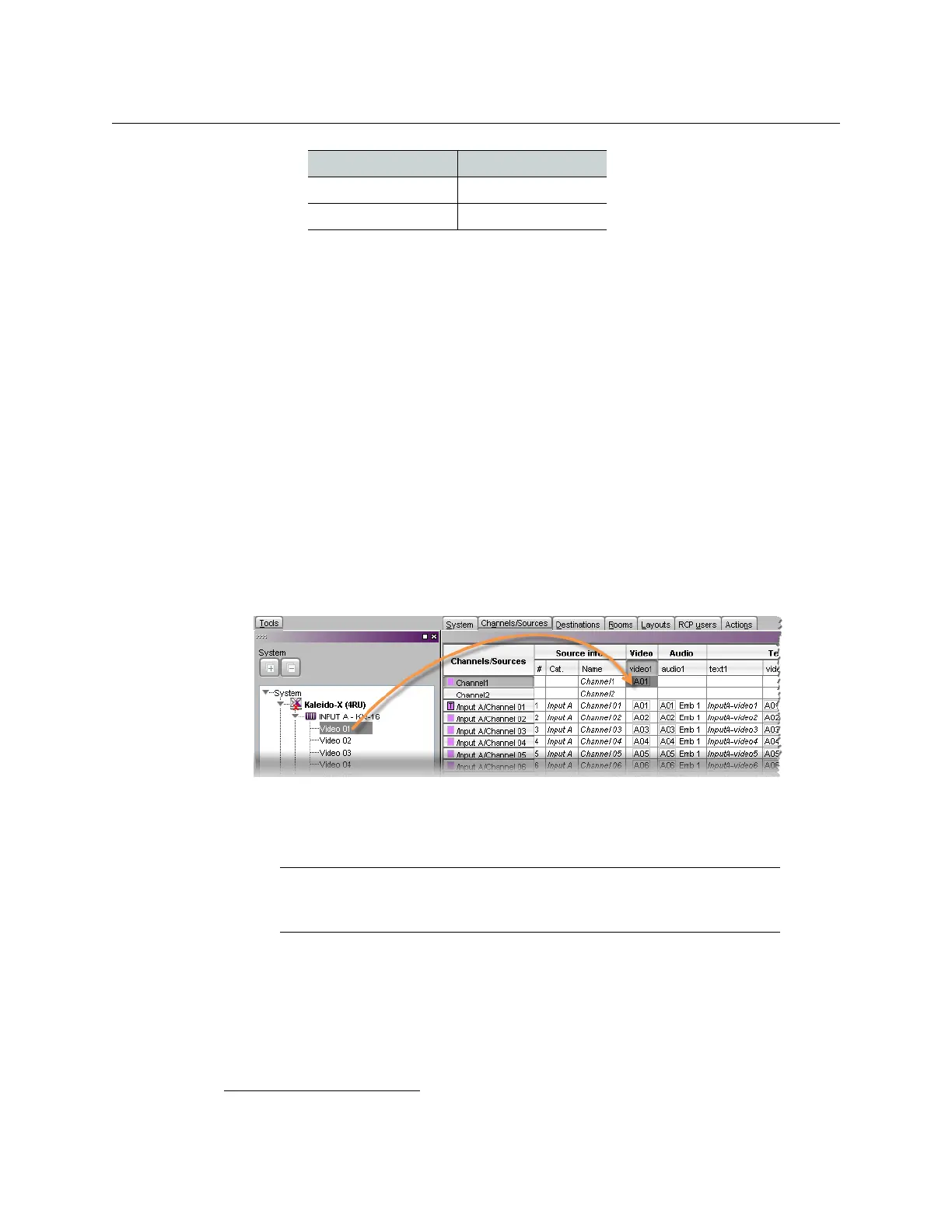 Sources table with a selected cell in the Video level category for Channel1