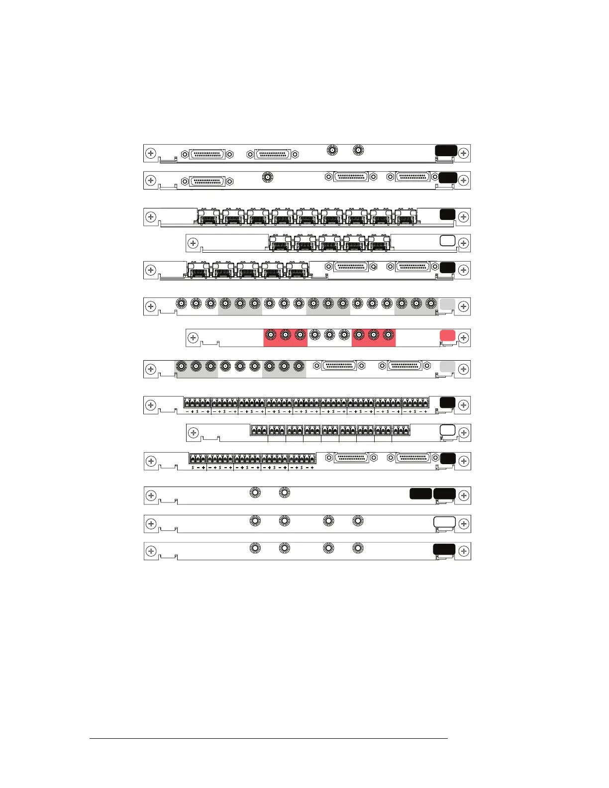Viewing from top to bottom backplanes are grouped by connector type with one backplane for