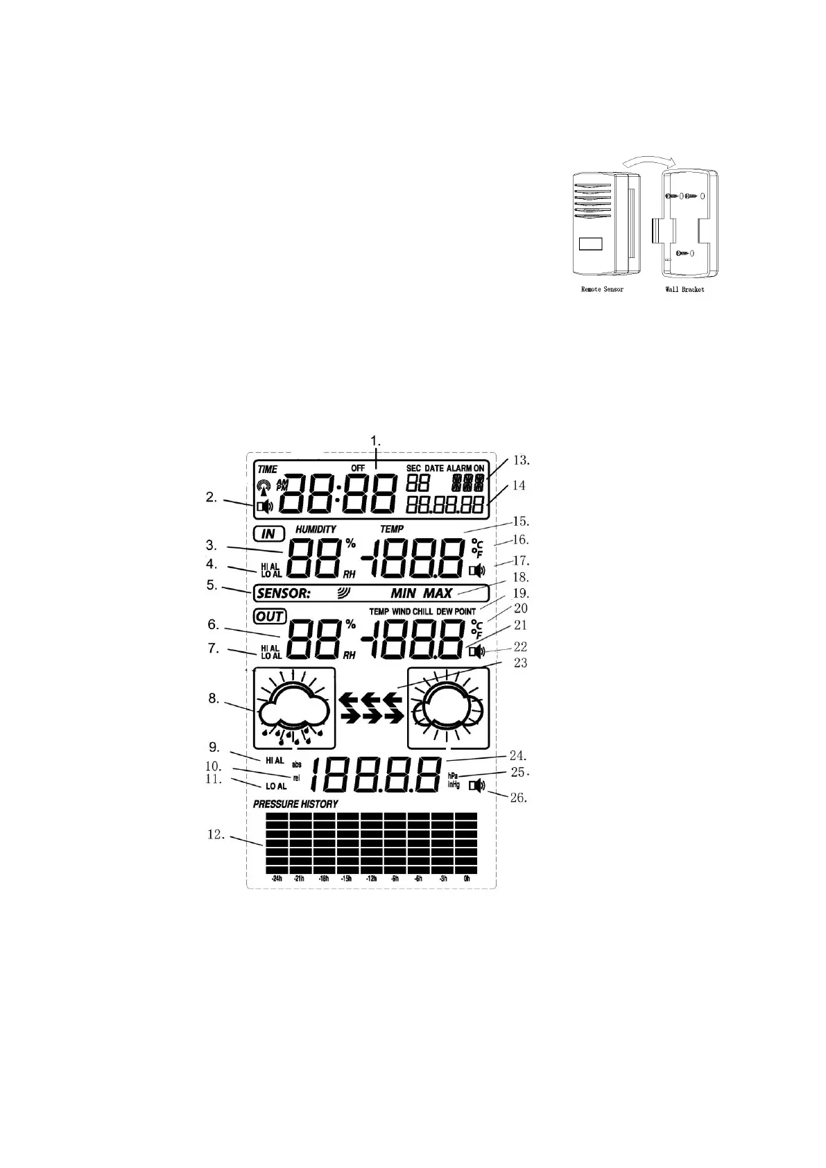 The following illustration shows the full segments of the LCD for description purposes only and will not
