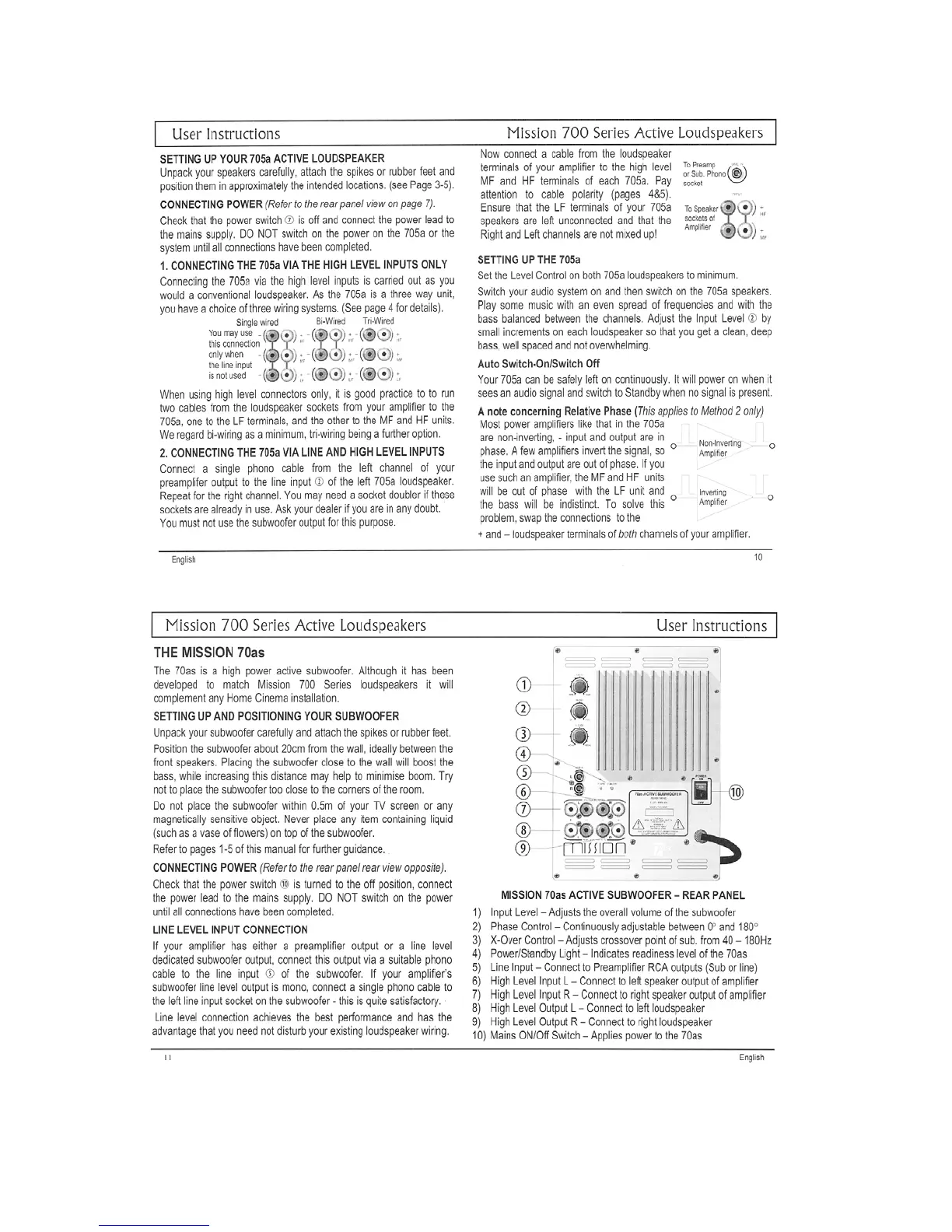 Mission 701 - Setting Up the 705 a Active Loudspeaker; Auto Switch-On;Switch Off; Mission 70 as Subwoofer Setup
