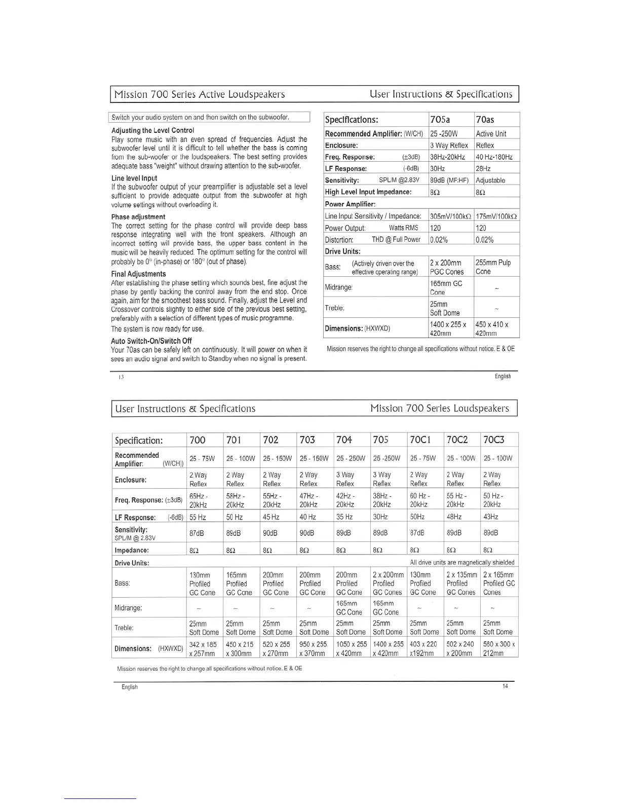 Mission 701 - Subwoofer Level, Phase and Final Adjustments; Specifications and Warranty; Technical Specifications