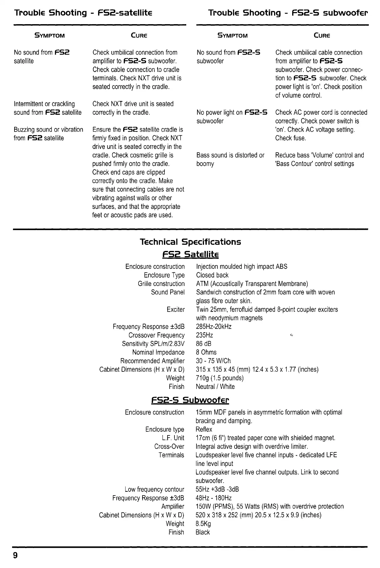 Mission FS2 - Trouble Shooting-F52 Satellite; Trouble Shooting-F52-5 Subwoofer; Technical Specifications