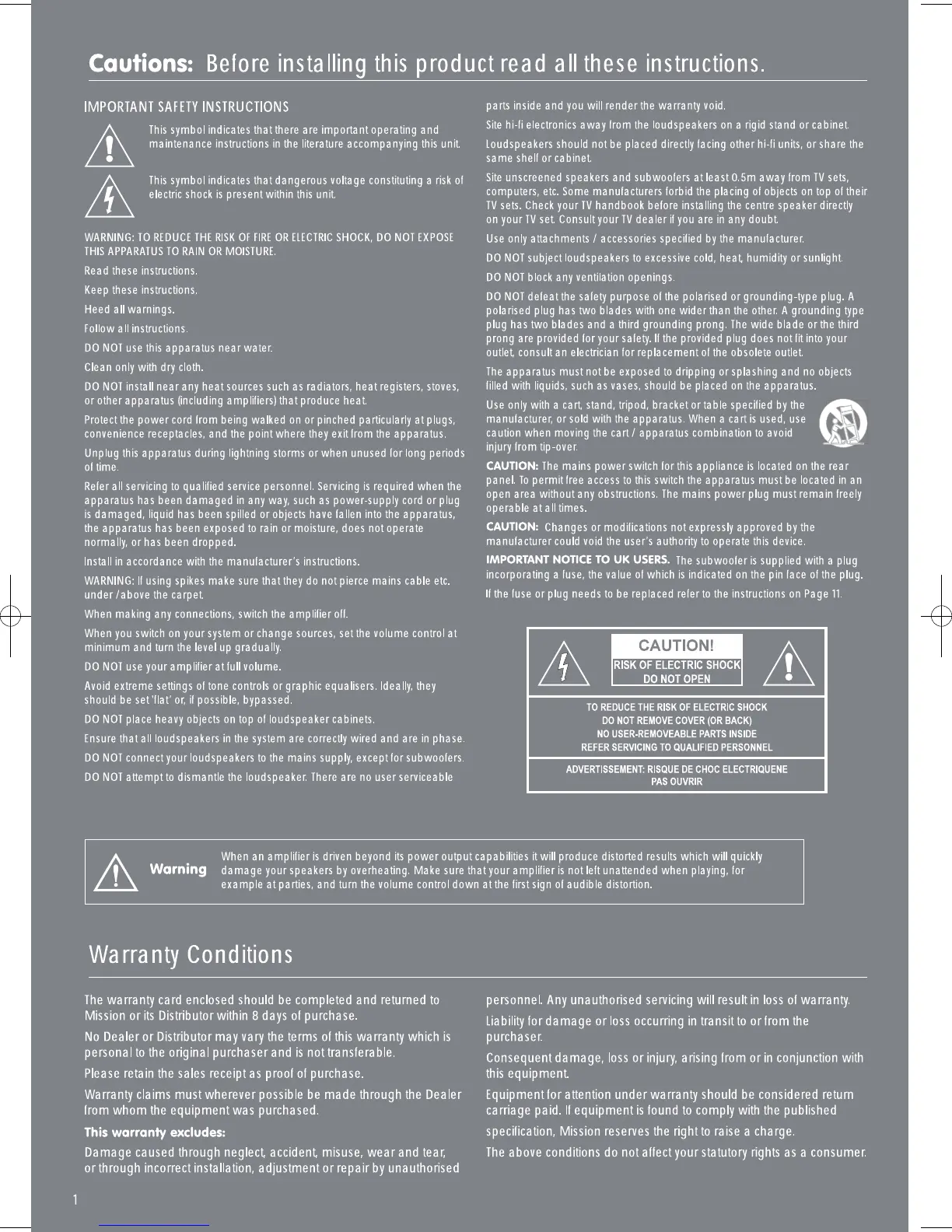Mission MS-300 - IMPORTANT SAFETY INSTRUCTIONS; Warranty Conditions