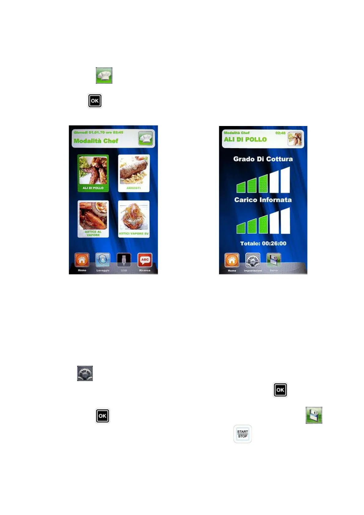 Scorrere le ricette con i tasti frecce e le pagine con lo Slider. Selezionare la ricetta desiderata e