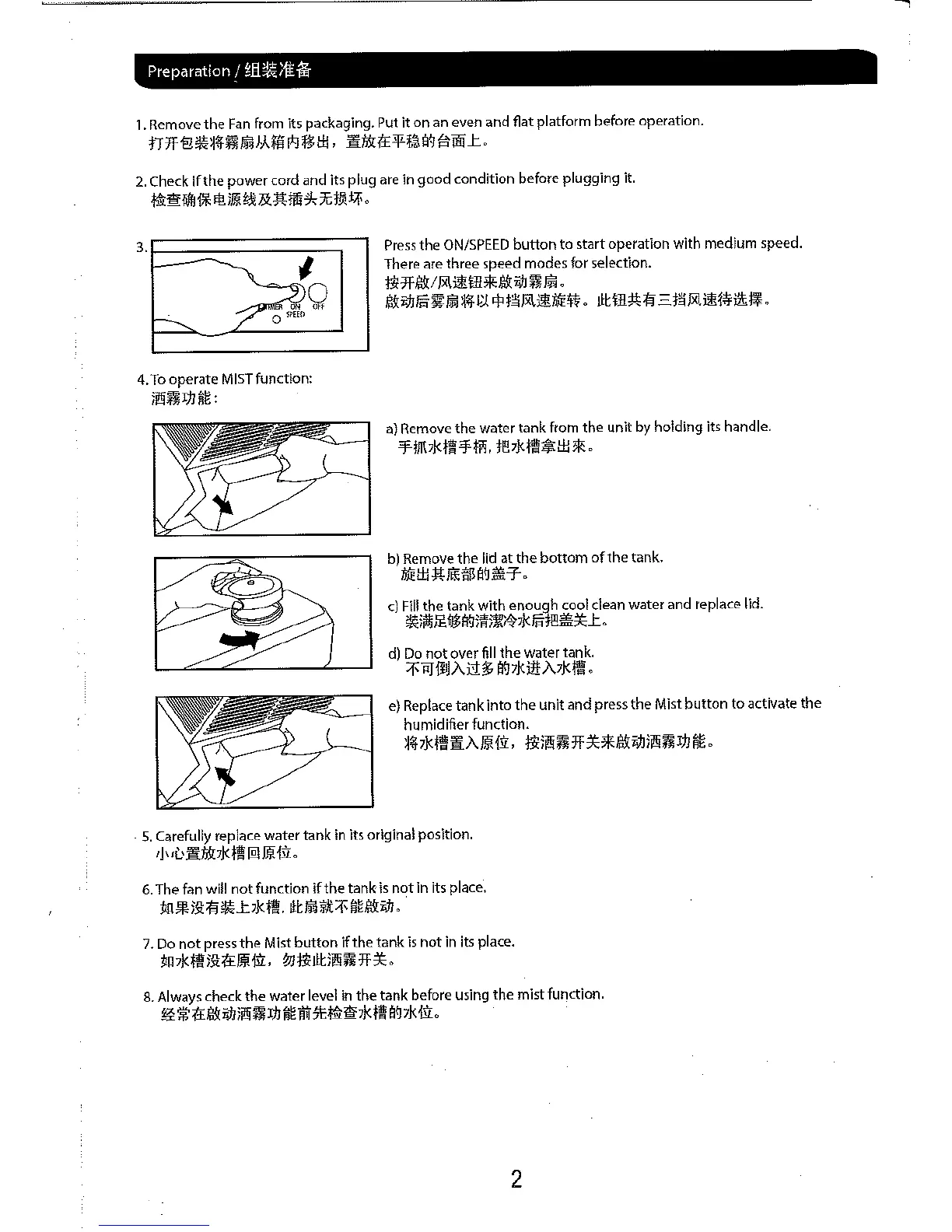Mistral MMF55R - Initial Setup and Operation; Unpacking and Initial Checks; Starting the Fan; Mist Function Setup