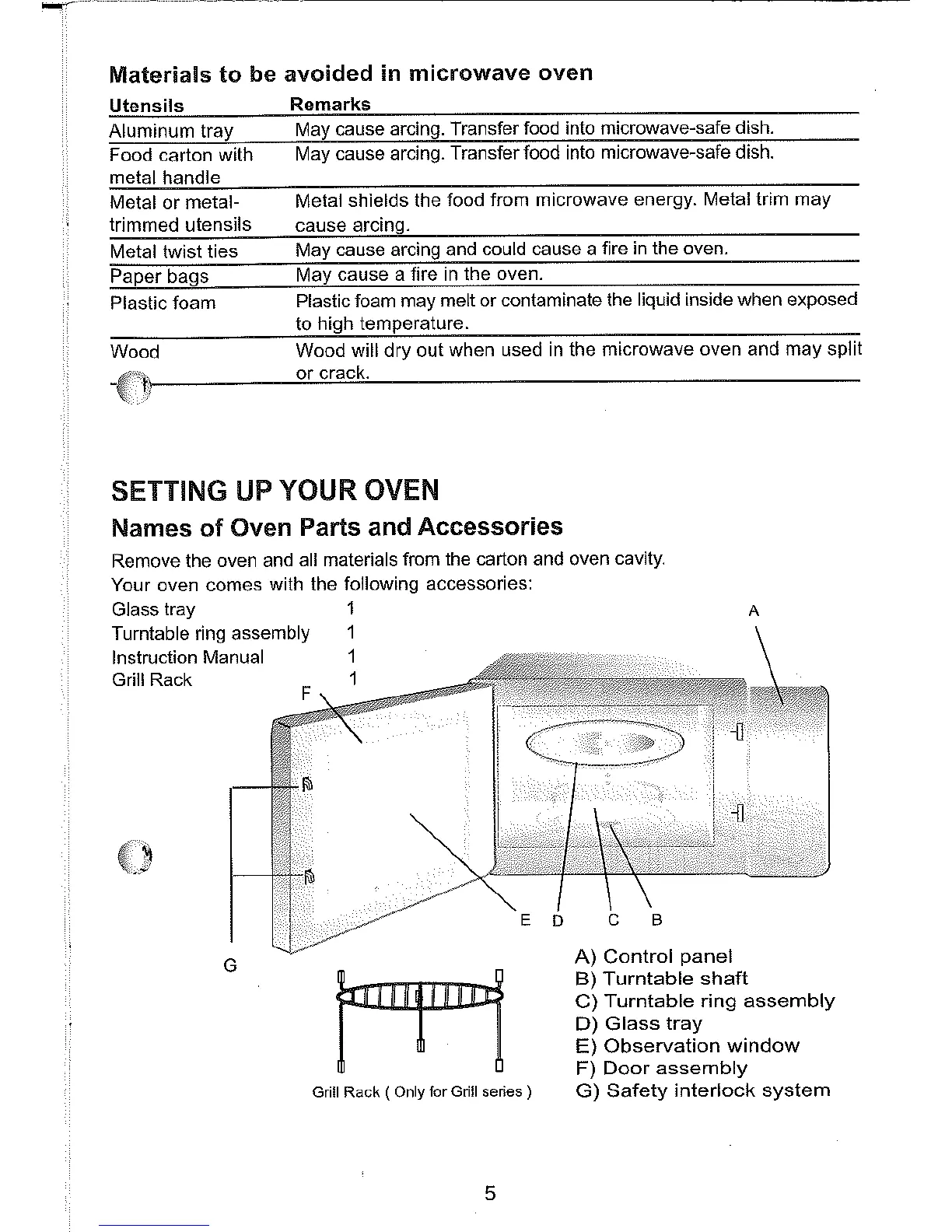 Mistral MMWC25SS3 - Unsafe Microwave Utensils; SETTING UP YOUR OVEN; Oven Parts and Accessories Identification