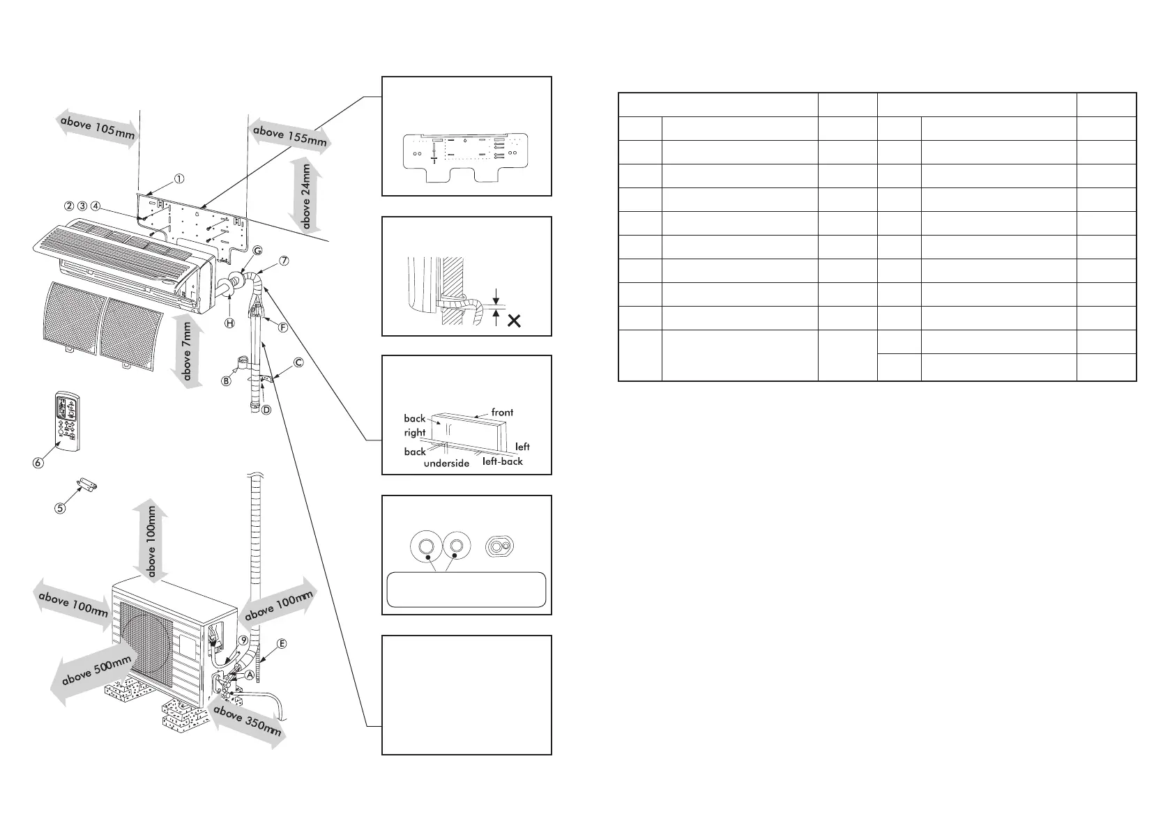 Indoor unit accessories Quantity Installation accessories Quantity