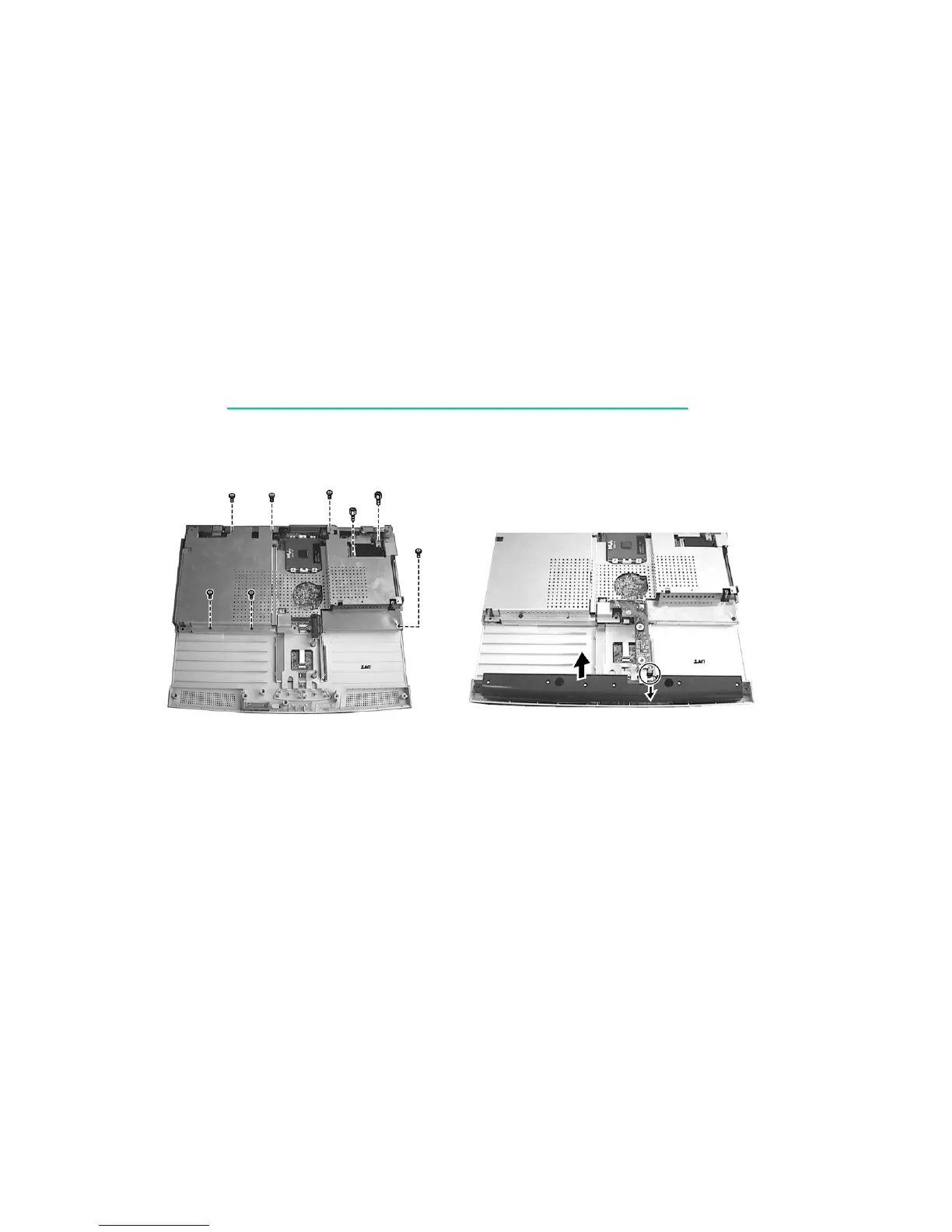 6. Remove six screws and two hexnut screws fastening the metal shield, and then lift the shield up