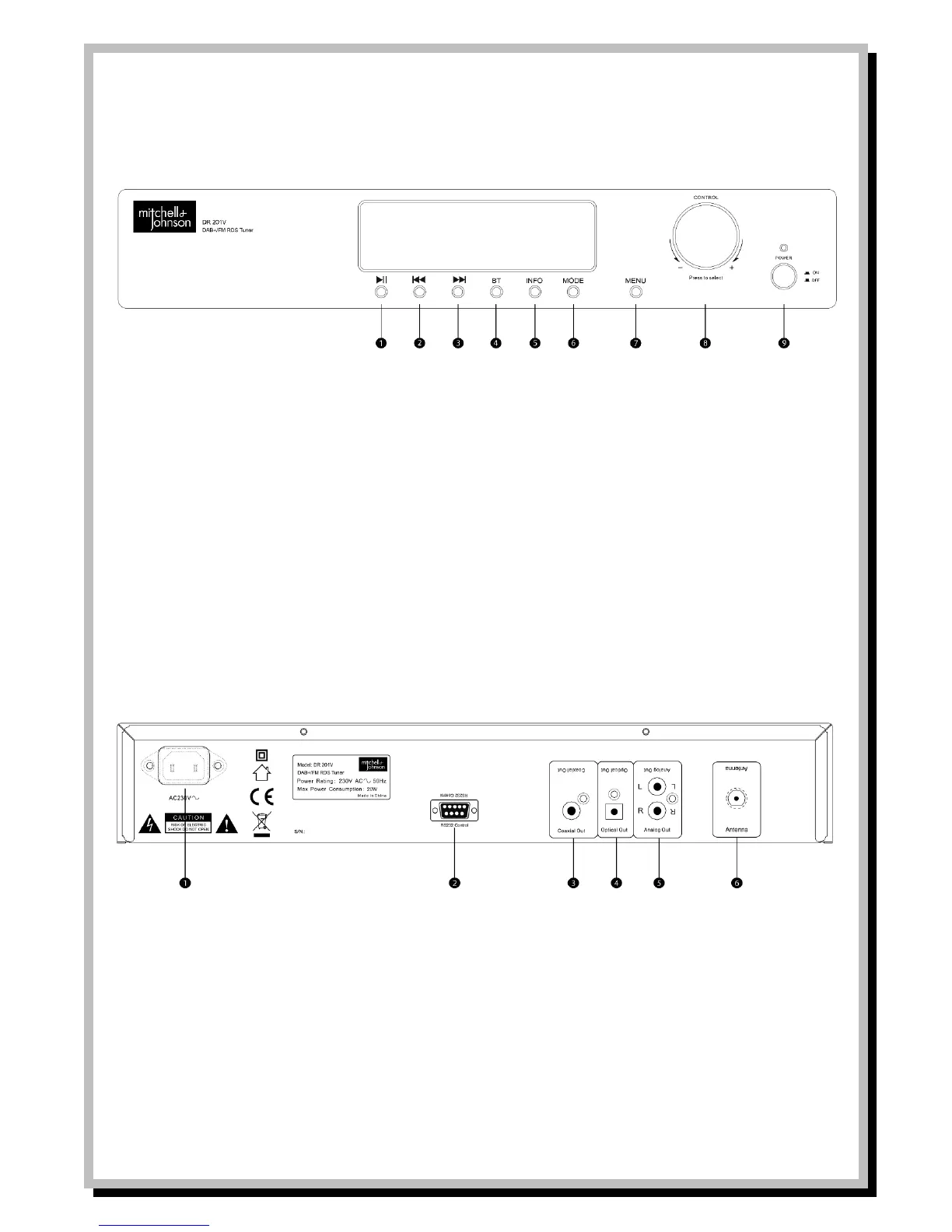 8 Control knob. When in Menu mode, use to move through menu items and press to select. When in DAB/FM mode turn to