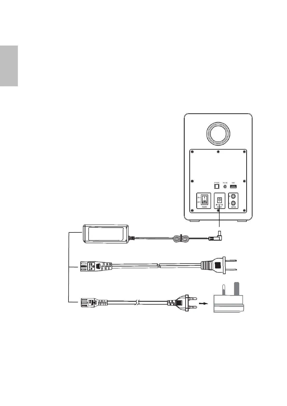 Plug one end of the power cable into the 2-pin socket on the AC power adaptor
