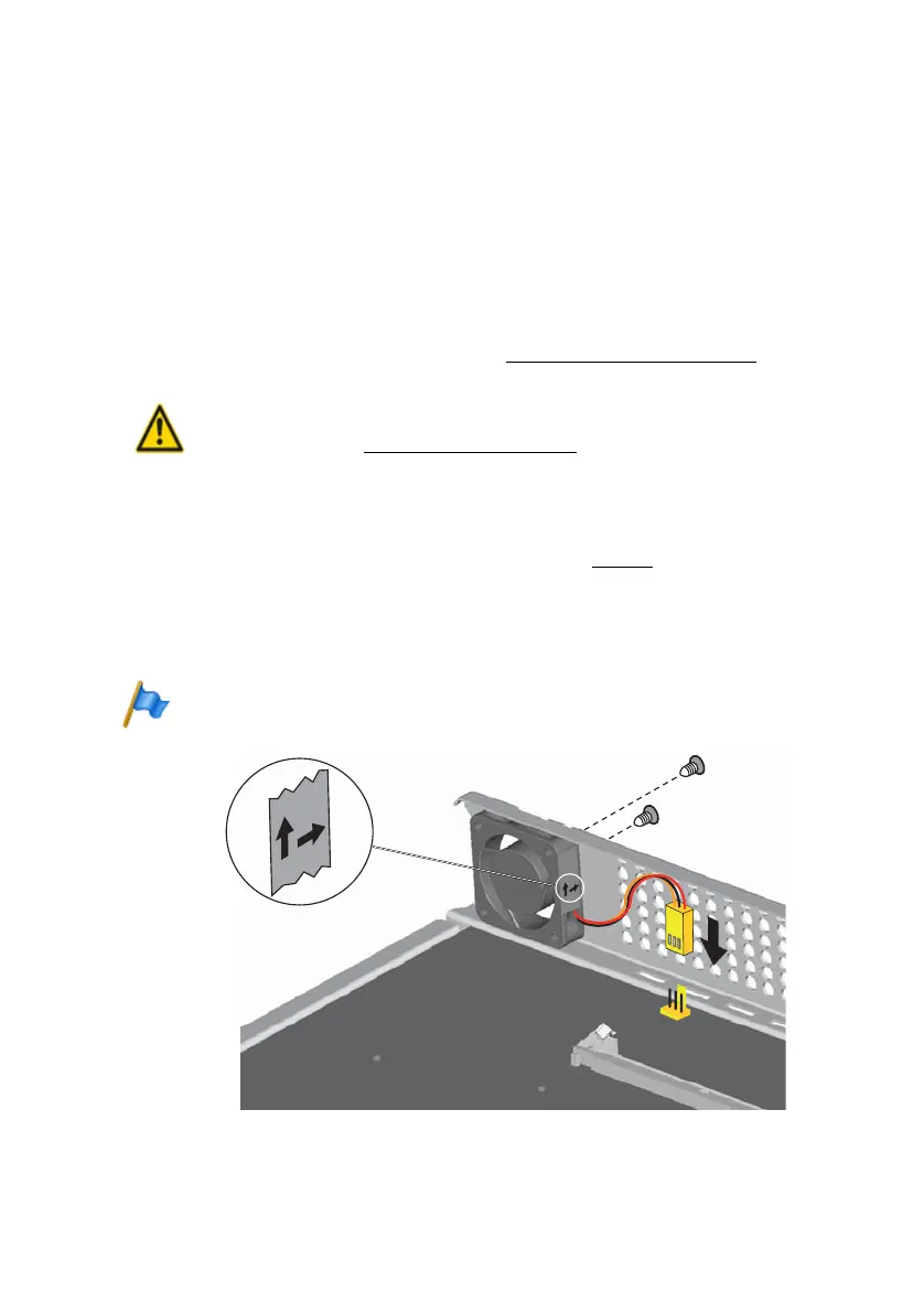 3. Use the two screws to fit the fan to the inside of the housing. Take note of the arrows