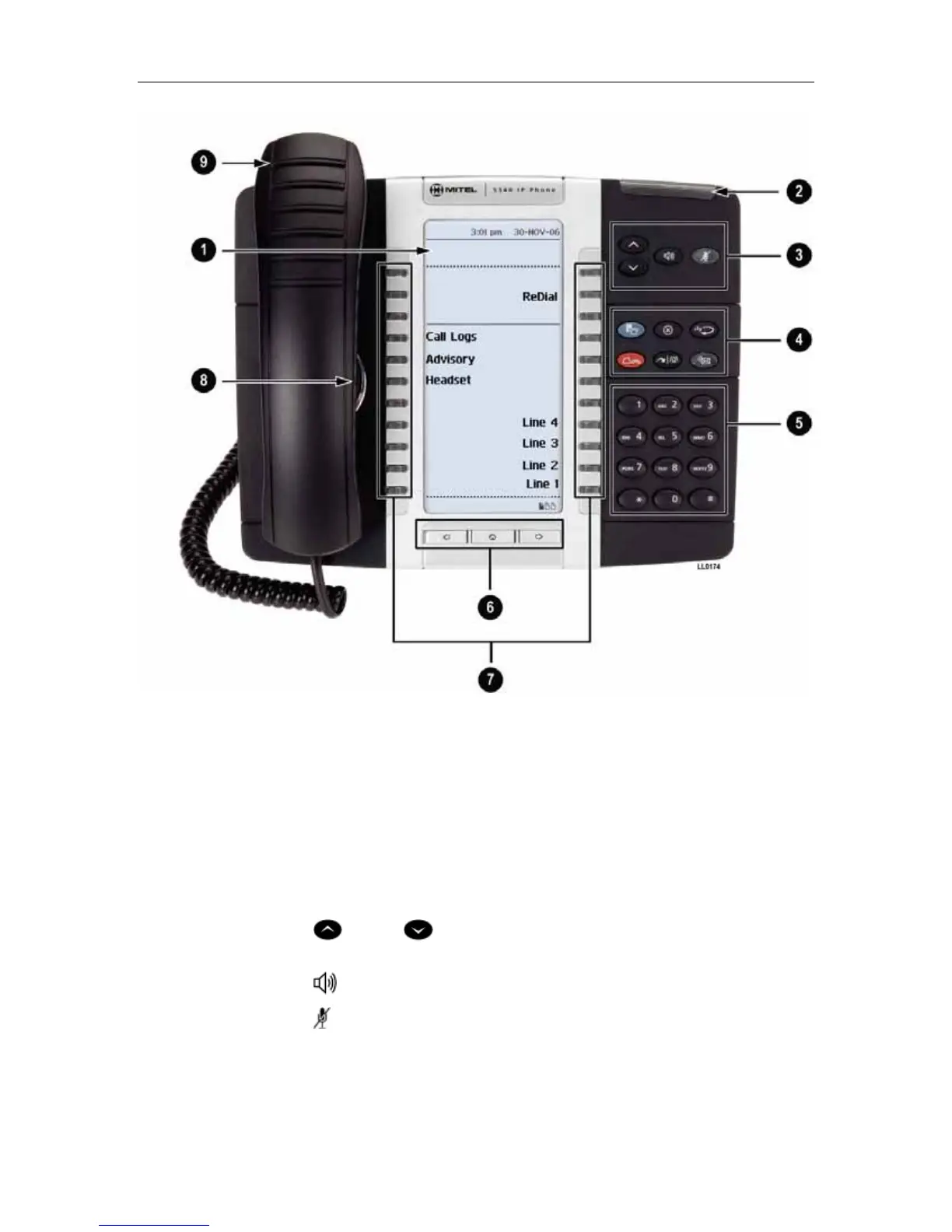 (UP) and (DOWN) provide volume control for the ringer, handset, and