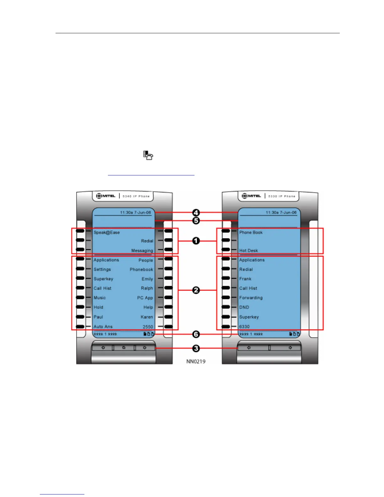 The 5340 and 5330 IP Phone default phone windows and keys are shown and described